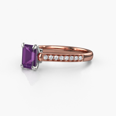 Der oben gezeigte Roségold Verlobungsring wird Valorie eme 2 genannt. Es ist ein Pavé Solitär Ring, da er einen zentralen Edelstein und ein Band mit Pavé-Fassung hat. Der klassische Pavé Solitär Verlobungsring ist in der Kombination 14 Karat Roségold mit Weißgold und ist mit einem smaragd schliff 6.5x4.5 mm Amethyst-Mittelstein besetzt und das Band hat eine Pavé-Fassung mit Diamanten. Jedes Schmuckstück wird hergestellt von einem Team leidenschaftlicher Goldschmiede und Schmuckdesigner. Das wird Ihr Kronjuwel unbedingt zu einem Blickfang machen. Um den zentralen Stein noch mehr zu betonen, hat das Band eine Pavé-Fassung mit weiteren Amethyst. Durch die offenen Krappen kann das Licht aus mehreren Winkeln auf den Amethyst treffen und der Amethyst-Ring funkelt noch mehr. Das obere Foto zeigt die leidenschaftlich handgefertigten Details des Rings. Die hohe Positionierung der Mittelstein ist ein echter Blickfang. Der perfekte Verlobungsring für das Kronjuwel Ihres Lebens!Mit unserer modernen Technik können wir Schmuckstücke von höchster Qualität mit größter Sorgfalt für Sie entwerfen und anpassen. Unsere Verlobungsringe sind immer um 30 Prozent günstiger als bei anderen Juwelieren. Wir fertigen Verlobungsringe auf Bestellung, also müssen wir keine großen Lager unterhalten. Wenn Sie ein bestimmtes Budget haben, beraten wir Sie gerne entsprechend.Haben Sie irgendwo einen bestimmten Verlobungsring gefunden, den Sie Ihrem Liebsten schenken möchten? Sie können uns gerne sagen, was Sie wollen und wir werden Ihr Design in einen Einzigartigen klassische Verlobungsring verwandeln. Sie können die Entwicklungen Ihres Ringdesigns verfolgen, da wir 3D-Zeichnungen verwenden. Das gibt Ihnen eine realistische Vorschau, wie Ihr Design aussehen wird. Sie können auch einen Dummy vorbestellen. Ein Dummy ist ein Kunststoffring, der nach Ihrem Ringdesign gestaltet werden kann. Sie können ihn anprobieren und prüfen, ob seine Breite und Größe für Sie geeignet sind. Wir senden Ihnen gerne ein unverbindliches Angebot zu einem fairen Preis/Leistungsverhältnis. Sie werden in Anbetracht der Qualität des Rings und der Edelsteine überrascht sein.Um es einfacher zu machen, bieten wir eine kostenlose 30-tägige Rücksendung.