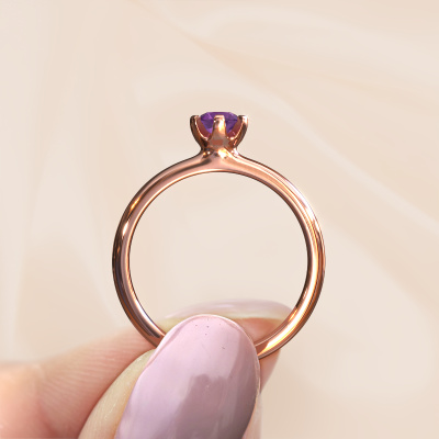 In Ihren Augen ist keine andere so wie sie. Sie ist genau die Eine, anders als alle anderen und rein... Diese Qualitäten werden von unserem moderne Roségold Solitär Amethyst Verlobungsring perfekt unterstrichen. Dieser Amethyst wird von unseren leidenschaftlichen Juwelieren sorgfältig ausgewählt. Er entspricht den einzigartigen Qualitäten der Liebe Ihres Lebens. Es gibt keinen besseren Weg, als dieses Symbol der wahren Liebe, um Ihren Antrag zu würdigen. Der oben gezeigte Ring wird Lorretta genannt. Wir nennen das einen Solitär-Ring, weil er einen einzigen Edelstein hat. Es ist ein 14 Karat Roségold ring, mit 4.7 mm rund Amethyst. Jedes Schmuckstück wird hergestellt mit Leidenschaft und Liebe, von einem unserer Meister-Goldschmiede.Durch die Kombination modernster Technik mit uralter Handwerkskunst können wir alle Verlobungsringe in unserem eigenen Studio anfertigen. Jedes Schmuckstück wird auf Anfrage gefertigt. Das ist vorteilhaft, weil wir Ihnen dadurch einen Preis anbieten können, den Sie nirgendwo anders finden.Unser Team fügt unserer Online-Kollektion täglich neue Designs hinzu. Unsere Designer und Goldschmiede arbeiten zusammen, um das beste Design zu kreieren. Wir bemühen uns, eine vielfältige Kollektion von Schmuckstücken anzubieten. Vielleicht haben Sie ein bestimmtes Design im Sinn. Eines, dass Sie irgendwo gesehen haben. Gerne geben wir Ihnen eine kostenlose Beratung. Wir machen Ihnen ein Angebot, basierend auf einem fairen Preis/Leistungsverhältnis, das Sie verblüffen wird.Um es einfacher zu machen, bieten wir eine kostenlose 30-tägige Rücksendung.