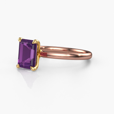 Der oben gezeigte Verlobungsring wird Crystal EME 1 genannt. Wir nennen das einen Solitär-Ring, denn er hat einen einzelnen Edelstein. Es ist ein 14 Karat Roségold ring, mit 8x6 mm smaragd schliff Amethyst. Das Besondere an unserem Konfigurator ist dass Sie selbst einem Schmuckstück zusammenstellen können zu einem eigenen persönlichen Schmuckstück. Dieser Solitäre Verlobungsring ist gefertigt in der Edelmetall Kombination Roségold mit Gold, aber Sie können also auch wählen aus anderen Farben. Jedes Schmuckstück wird hergestellt mit Leidenschaft und Liebe, von einem unserer Meister-Goldschmiede. Der Solitär-Verlobungsring ist eine Sonderform des Verlobungsring. Seine offenen Krappen ermöglichen, dass Licht aus mehr Winkeln auf den Edelstein trifft. Dieser klassische Verlobungsring ist durch die hohe Positionierung des Edelsteins ein atemberaubender Blickfang. Wir schmücken diesen Solitär-Ring sorgfältig von Hand, damit Sie Ihren Anfrage mit einem einzigartigen Ring würdigen können. Die Liebe Ihres Lebens verdient nur das Beste. Nach Erhalt Ihrer Bestellung beginnen unsere Goldschmiede mit Leidenschaft den kreativen Prozess und fertigen Ihren Verlobungsring in unserem eigenen Studio. Da wir keine großen Lager haben, werden diese Kosten nicht an Sie weitergegeben. Unsere Preisgestaltung ist der Beweis dafür! Wir bieten Schmuck zum niedrigsten Preis, garantiert.Unsere Designer und Goldschmiede arbeiten jeden Tag zusammen und versuchen, neue Schmuckstücke zu kreieren. Vielleicht haben Sie irgendwo einen schönen, klassische Verlobungsring gefunden, nach dem Ihr einzigartiger Ring gestaltet werden kann. Setzen Sie sich mit uns in Verbindung. Wir machen Ihnen ein Angebot, basierend auf einem fairen Preis/Leistungsverhältnis, das Sie begeistern wird.Um es einfacher zu machen, bieten wir eine kostenlose 30-tägige Rücksendung.