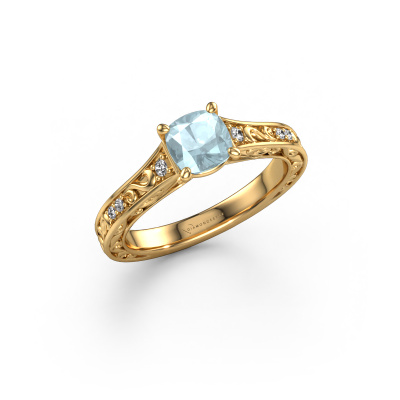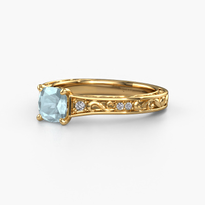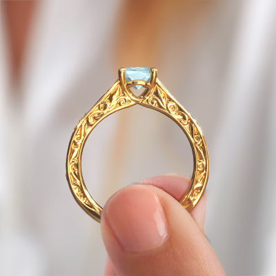 Der oben gezeigte Ring wird Mallory cus genannt. Es ist ein Pavé Solitär Ring, da er einen zentralen Edelstein und ein Band mit Pavé-Fassung hat. Dieser 14 Karat Gold ring ist mit einem 5.5 mm cussion Aquamarin-Mittelstein besetzt und das Band hat eine Pavé-Fassung mit Diamanten. Jedes Schmuckstück wird von unseren Meister-Goldschmieden in unserem eigenen Studio für Sie gefertigt.Dieser Keltische Gold Pavé Solitär Verlobungsring mit Pavé-Fassung hat einen exquisiten, cussion Aquamarin als Mittelstein. Um den zentralen Stein noch mehr zu betonen, hat das Band eine Pavé-Fassung mit weiteren Diamanten. Durch die offenen Krappen kann das Licht aus mehreren Winkeln auf den Aquamarin treffen und der Aquamarin-Ring funkelt noch mehr. Das obere Foto zeigt die leidenschaftlich handgefertigten Details des Rings. Die hohe Positionierung der Mittelstein ist ein echter Blickfang. Der perfekte Verlobungsring für das Kronjuwel Ihres Lebens!Mit unserer modernen Technik können wir Schmuckstücke von höchster Qualität mit größter Sorgfalt für Sie entwerfen und anpassen. Unsere Verlobungsringe sind immer um 30 Prozent günstiger als bei anderen Juwelieren. Wir fertigen Verlobungsringe auf Bestellung, also müssen wir keine großen Lager unterhalten. Wenn Sie ein bestimmtes Budget haben, beraten wir Sie gerne entsprechend.Verschiedene Arten von neuen Ringen werden täglich von unserem Team angefertigt. Vielleicht haben Sie irgendwo einen Pavé Solitär Verlobungsring gefunden. Einen, den Sie Ihrem Liebsten schenken möchten. Bitte zögern Sie nicht, unseren Schmuckdesignern Ihre Gedanken und Ihr Design zu zeigen. Wir würden gerne Ihr Design in einen Keltische Verlobungsring verwandeln. Sie können die Entwicklungen Ihres Ringdesigns verfolgen, da wir sehr detaillierte 3D-Zeichnungen verwenden. Darüber hinaus können Sie einen Dummy des Designs bestellen. Ein Dummy ist ein Kunststoffring, der nach Ihrem Ringdesign gestaltet werden kann. Sie können ihn anprobieren und prüfen, ob der Verlobungsring Ihren Vorstellungen entspricht. Wir senden Ihnen gerne ein unverbindliches Angebot zu einem fairen Preis/Leistungsverhältnis. Das Angebot wird Sie angesichts der Qualität des Rings und der Edelsteine verblüffen.Um es einfacher zu machen, bieten wir eine kostenlose 30-tägige Rücksendung.