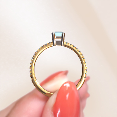 Der oben gezeigte Ring wird Denita 2 EME genannt. Es ist ein Pavé Solitär Ring, da er einen zentralen Edelstein und ein Band mit Pavé-Fassung hat. Dieser 14 Karat Gold ring ist mit einem 6x4 mm smaragd schliff Aquamarin-Mittelstein besetzt und das Band hat eine Pavé-Fassung mit Diamanten. Jedes Schmuckstück wird von unseren Meister-Goldschmieden in unserem eigenen Studio für Sie gefertigt.Dieser traditionell Gold Pavé Solitär Verlobungsring mit Pavé-Fassung hat einen exquisiten, smaragd schliff Aquamarin als Mittelstein. Um den zentralen Stein noch mehr zu betonen, hat das Band eine Pavé-Fassung mit weiteren Diamanten. Durch die offenen Krappen kann das Licht aus mehreren Winkeln auf den Aquamarin treffen und der Aquamarin-Ring funkelt noch mehr. Das obere Foto zeigt die leidenschaftlich handgefertigten Details des Rings. Die hohe Positionierung der Mittelstein ist ein echter Blickfang. Der perfekte Verlobungsring für das Kronjuwel Ihres Lebens!Haben Sie ein bestimmtes Budget? Sie können uns gerne kontaktieren, damit wir Ihre Optionen besprechen können. Wir bieten unsere Verlobungsringe zum garantiert besten Preis, denn wir fertigen sie auf Bestellung. Solche Preise finden Sie nirgendwo anders!Unser Team fügt unserer Online-Kollektion täglich neue Designs hinzu. Unsere Designer und Goldschmiede arbeiten zusammen, um das beste Design zu kreieren. Wir bemühen uns, eine vielfältige Kollektion von Schmuckstücken anzubieten. Vielleicht haben Sie ein bestimmtes Design im Sinn. Eines, dass Sie irgendwo gesehen haben. Gerne geben wir Ihnen eine kostenlose Beratung. Wir machen Ihnen ein Angebot, basierend auf einem fairen Preis/Leistungsverhältnis, das Sie verblüffen wird.Um es einfacher zu machen, bieten wir eine kostenlose 30-tägige Rücksendung.
