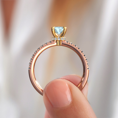 Der oben gezeigte Roségold Verlobungsring wird Crystal OVL 4 genannt. Es ist ein Pavé Solitär Ring, da er einen zentralen Edelstein und ein Band mit Pavé-Fassung hat. Der moderne Pavé Solitär Verlobungsring ist in der Kombination 14 Karat Roségold mit Gold und ist mit einem oval 7x5 mm Aquamarin-Mittelstein besetzt und das Band hat eine Pavé-Fassung mit Diamanten. Jedes Schmuckstück wird hergestellt mit Leidenschaft und Liebe, von einem unserer Meister-Goldschmiede. Um den zentralen Stein noch mehr zu betonen, hat das Band eine Pavé-Fassung mit weiteren Aquamarin. Durch die offenen Krappen kann das Licht aus mehreren Winkeln auf den Aquamarin treffen und der Aquamarin-Ring funkelt noch mehr. Das obere Foto zeigt die leidenschaftlich handgefertigten Details des Rings. Die hohe Positionierung der Mittelstein ist ein echter Blickfang. Der perfekte Verlobungsring für das Kronjuwel Ihres Lebens!Nach Erhalt Ihrer Bestellung beginnen unsere Goldschmiede mit Leidenschaft den kreativen Prozess und fertigen Ihren Verlobungsring in unserem eigenen Studio. Da wir keine großen Lager haben, werden diese Kosten nicht an Sie weitergegeben. Unsere Preisgestaltung ist der Beweis dafür! Wir bieten Schmuck zum niedrigsten Preis, garantiert.Unser Team fügt unserer Online-Kollektion täglich neue Designs hinzu. Unsere Designer und Goldschmiede arbeiten zusammen, um das beste Design zu kreieren. Wir bemühen uns, eine vielfältige Kollektion von Schmuckstücken anzubieten. Vielleicht haben Sie ein bestimmtes Design im Sinn. Eines, dass Sie irgendwo gesehen haben. Gerne geben wir Ihnen eine kostenlose Beratung. Wir machen Ihnen ein Angebot, basierend auf einem fairen Preis/Leistungsverhältnis, das Sie verblüffen wird.Um es einfacher zu machen, bieten wir eine kostenlose 30-tägige Rücksendung.