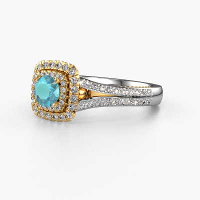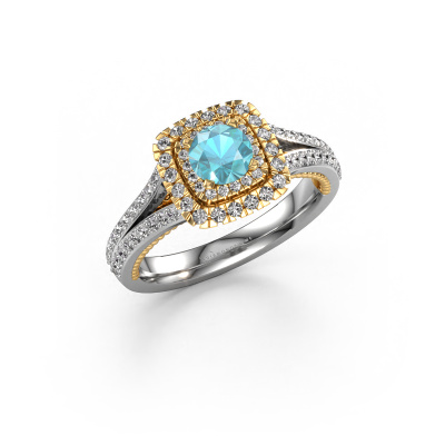 Der oben gezeigte Weißgold Verlobungsring wird Annette genannt. Es ist ein Halo Ring, da er einen zentralen Edelstein und ein Band mit Pavé-Fassung hat. Der Vintage Halo Verlobungsring ist in der Kombination 14 Karat Weißgold mit Gold und ist mit einem rund 5 mm Blau Topas-Mittelstein besetzt und das Band hat eine Pavé-Fassung mit Diamanten. Jedes Schmuckstück wird von unseren Meister-Goldschmieden in unserem eigenen Studio für Sie gefertigt. Um den zentralen Stein noch mehr zu betonen, hat das Band eine Pavé-Fassung mit weiteren Blau Topas. Durch die offenen Krappen kann das Licht aus mehreren Winkeln auf den Blau Topas treffen und der Blau Topas-Ring funkelt noch mehr. Das obere Foto zeigt die leidenschaftlich handgefertigten Details des Rings. Die hohe Positionierung der Mittelstein ist ein echter Blickfang. Der perfekte Verlobungsring für das Kronjuwel Ihres Lebens!Nach Erhalt Ihrer Bestellung beginnen unsere Goldschmiede mit Leidenschaft den kreativen Prozess und fertigen Ihren Verlobungsring in unserem eigenen Studio. Da wir keine großen Lager haben, werden diese Kosten nicht an Sie weitergegeben. Unsere Preisgestaltung ist der Beweis dafür! Wir bieten Schmuck zum niedrigsten Preis, garantiert.Haben Sie irgendwo einen bestimmten Verlobungsring gefunden, den Sie Ihrem Liebsten schenken möchten? Sie können uns gerne sagen, was Sie wollen und wir werden Ihr Design in einen Einzigartigen Vintage Verlobungsring verwandeln. Sie können die Entwicklungen Ihres Ringdesigns verfolgen, da wir 3D-Zeichnungen verwenden. Das gibt Ihnen eine realistische Vorschau, wie Ihr Design aussehen wird. Sie können auch einen Dummy vorbestellen. Ein Dummy ist ein Kunststoffring, der nach Ihrem Ringdesign gestaltet werden kann. Sie können ihn anprobieren und prüfen, ob seine Breite und Größe für Sie geeignet sind. Wir senden Ihnen gerne ein unverbindliches Angebot zu einem fairen Preis/Leistungsverhältnis. Sie werden in Anbetracht der Qualität des Rings und der Edelsteine überrascht sein.Um es einfacher zu machen, bieten wir eine kostenlose 30-tägige Rücksendung.