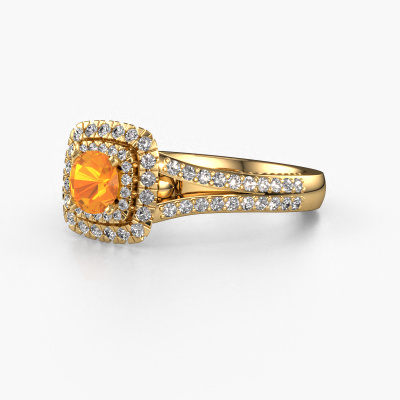 Der oben gezeigte Gold Verlobungsring wird Annette genannt. Es ist ein Halo Ring, da er einen zentralen Edelstein und ein Band mit Pavé-Fassung hat. Der Vintage Halo Verlobungsring ist in der Kombination 14 Karat Gold mit Gold und ist mit einem rund 5 mm Citrin-Mittelstein besetzt und das Band hat eine Pavé-Fassung mit Diamanten. Jedes Schmuckstück wird von unseren Meister-Goldschmieden in unserem eigenen Studio für Sie gefertigt. Um den zentralen Stein noch mehr zu betonen, hat das Band eine Pavé-Fassung mit weiteren Citrin. Durch die offenen Krappen kann das Licht aus mehreren Winkeln auf den Citrin treffen und der Citrin-Ring funkelt noch mehr. Das obere Foto zeigt die leidenschaftlich handgefertigten Details des Rings. Die hohe Positionierung der Mittelstein ist ein echter Blickfang. Der perfekte Verlobungsring für das Kronjuwel Ihres Lebens!Nach Erhalt Ihrer Bestellung beginnen unsere Goldschmiede mit Leidenschaft den kreativen Prozess und fertigen Ihren Verlobungsring in unserem eigenen Studio. Da wir keine großen Lager haben, werden diese Kosten nicht an Sie weitergegeben. Unsere Preisgestaltung ist der Beweis dafür! Wir bieten Schmuck zum niedrigsten Preis, garantiert.Haben Sie irgendwo einen bestimmten Verlobungsring gefunden, den Sie Ihrem Liebsten schenken möchten? Sie können uns gerne sagen, was Sie wollen und wir werden Ihr Design in einen Einzigartigen Vintage Verlobungsring verwandeln. Sie können die Entwicklungen Ihres Ringdesigns verfolgen, da wir 3D-Zeichnungen verwenden. Das gibt Ihnen eine realistische Vorschau, wie Ihr Design aussehen wird. Sie können auch einen Dummy vorbestellen. Ein Dummy ist ein Kunststoffring, der nach Ihrem Ringdesign gestaltet werden kann. Sie können ihn anprobieren und prüfen, ob seine Breite und Größe für Sie geeignet sind. Wir senden Ihnen gerne ein unverbindliches Angebot zu einem fairen Preis/Leistungsverhältnis. Sie werden in Anbetracht der Qualität des Rings und der Edelsteine überrascht sein.Um es einfacher zu machen, bieten wir eine kostenlose 30-tägige Rücksendung.