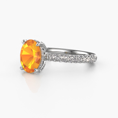 Der oben gezeigte Platin Verlobungsring wird Saskia 2 ovl genannt. Es ist ein Pavé Solitär Ring, da er einen zentralen Edelstein und ein Band mit Pavé-Fassung hat. Der exklusive Pavé Solitär Verlobungsring ist in der Kombination Platin mit Platin und ist mit einem oval 9x7 mm Citrin-Mittelstein besetzt und das Band hat eine Pavé-Fassung mit Lab grown Diamant. Jedes Schmuckstück wird von unseren Meister-Goldschmieden in unserem eigenen Studio für Sie gefertigt. Um den zentralen Stein noch mehr zu betonen, hat das Band eine Pavé-Fassung mit weiteren Citrin. Durch die offenen Krappen kann das Licht aus mehreren Winkeln auf den Citrin treffen und der Citrin-Ring funkelt noch mehr. Das obere Foto zeigt die leidenschaftlich handgefertigten Details des Rings. Die hohe Positionierung der Mittelstein ist ein echter Blickfang. Der perfekte Verlobungsring für das Kronjuwel Ihres Lebens!Nach Erhalt Ihrer Bestellung beginnen unsere Goldschmiede mit Leidenschaft den kreativen Prozess und fertigen Ihren Verlobungsring in unserem eigenen Studio. Da wir keine großen Lager haben, werden diese Kosten nicht an Sie weitergegeben. Unsere Preisgestaltung ist der Beweis dafür! Wir bieten Schmuck zum niedrigsten Preis, garantiert.Haben Sie irgendwo einen bestimmten Verlobungsring gefunden, den Sie Ihrem Liebsten schenken möchten? Sie können uns gerne sagen, was Sie wollen und wir werden Ihr Design in einen Einzigartigen exklusive Verlobungsring verwandeln. Sie können die Entwicklungen Ihres Ringdesigns verfolgen, da wir 3D-Zeichnungen verwenden. Das gibt Ihnen eine realistische Vorschau, wie Ihr Design aussehen wird. Sie können auch einen Dummy vorbestellen. Ein Dummy ist ein Kunststoffring, der nach Ihrem Ringdesign gestaltet werden kann. Sie können ihn anprobieren und prüfen, ob seine Breite und Größe für Sie geeignet sind. Wir senden Ihnen gerne ein unverbindliches Angebot zu einem fairen Preis/Leistungsverhältnis. Sie werden in Anbetracht der Qualität des Rings und der Edelsteine überrascht sein.Um es einfacher zu machen, bieten wir eine kostenlose 30-tägige Rücksendung.