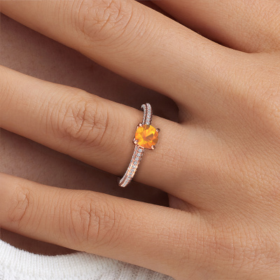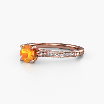 Der oben gezeigte Ring wird Elenore rnd genannt. Es ist ein Pavé Solitär Ring, da er einen zentralen Edelstein und ein Band mit Pavé-Fassung hat. Dieser 14 Karat Roségold ring ist mit einem 5.4 mm rund Citrin-Mittelstein besetzt und das Band hat eine Pavé-Fassung mit Lab grown Diamant. Jedes Schmuckstück wird von unseren Meister-Goldschmieden in unserem eigenen Studio für Sie gefertigt.Dieser exklusive Roségold Pavé Solitär Verlobungsring mit Pavé-Fassung hat einen exquisiten, rund Citrin als Mittelstein. Um den zentralen Stein noch mehr zu betonen, hat das Band eine Pavé-Fassung mit weiteren Lab grown Diamant. Durch die offenen Krappen kann das Licht aus mehreren Winkeln auf den Citrin treffen und der Citrin-Ring funkelt noch mehr. Das obere Foto zeigt die leidenschaftlich handgefertigten Details des Rings. Die hohe Positionierung der Mittelstein ist ein echter Blickfang. Der perfekte Verlobungsring für das Kronjuwel Ihres Lebens!Durch die Kombination modernster Technik mit uralter Handwerkskunst können wir alle Verlobungsringe in unserem eigenen Studio anfertigen. Jedes Schmuckstück wird auf Anfrage gefertigt. Das ist vorteilhaft, weil wir Ihnen dadurch einen Preis anbieten können, den Sie nirgendwo anders finden.Haben Sie irgendwo einen bestimmten Verlobungsring gefunden, den Sie Ihrem Liebsten schenken möchten? Sie können uns gerne sagen, was Sie wollen und wir werden Ihr Design in einen Einzigartigen exklusive Verlobungsring verwandeln. Sie können die Entwicklungen Ihres Ringdesigns verfolgen, da wir 3D-Zeichnungen verwenden. Das gibt Ihnen eine realistische Vorschau, wie Ihr Design aussehen wird. Sie können auch einen Dummy vorbestellen. Ein Dummy ist ein Kunststoffring, der nach Ihrem Ringdesign gestaltet werden kann. Sie können ihn anprobieren und prüfen, ob seine Breite und Größe für Sie geeignet sind. Wir senden Ihnen gerne ein unverbindliches Angebot zu einem fairen Preis/Leistungsverhältnis. Sie werden in Anbetracht der Qualität des Rings und der Edelsteine überrascht sein.Um es einfacher zu machen, bieten wir eine kostenlose 30-tägige Rücksendung.