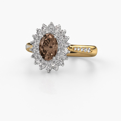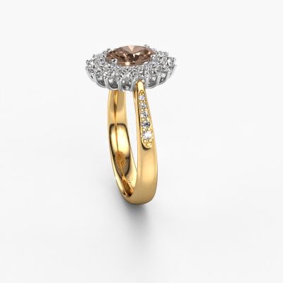 Der oben gezeigte Ring, mit dem Namen Alina 2, nennen wir einen Cluster Verlobungsring. Der Cluster Ring trägt einem zentralen Edelstein, umgeben von kleineren Steinen. Diese Version in 14 Karat Gold hat einen oval Braun Diamant von oval als Mittelstein, umschlossen von kleineren Diamanten. Was diesen exklusive Gold Cluster Ring besonders macht, sind die kleinen Edelsteine rund um den zentralen Braun Diamant, die wie eine schöne Blume geformt sind. Der umgebende Steinkranz umrahmt den Mittelstein so, dass er größer erscheint. Diese Art von Verlobungsring wird auch Blumen- oder Rosettenring genannt. Es ist sehr wichtig, dass die kleineren Braune Diamanten identisch positioniert sind, so dass es kein Spiel im Licht, sondern eine perfekte Einheit ergibt. Unsere erfahrenen Juweliere erledigen diese Arbeit. Jeder einzelne Stein wird sorgfältig von Hand gesetzt. Während der Herstellung wird der Lichteinfall ständig überwacht, um sicherzustellen, dass der spezielle Cluster-Effekt noch sichtbar ist. Am Ende bekommen Sie den perfekten Verlobungsring mit einem strahlenden Braun Diamant Edelstein Herzstück. Sie können sich die Wirkung eines solchen Ringes vorstellen, wenn Sie ihn an ihrem besonderen Tag für die Liebe Ihres Lebens zum Leuchten bringen. Jedes Schmuckstück wird nur für Sie persönlich hergestellt, mit Liebe zum Detail und Design.Durch die Kombination modernster Technik mit uralter Handwerkskunst können wir alle Verlobungsringe in unserem eigenen Studio anfertigen. Jedes Schmuckstück wird auf Anfrage gefertigt. Das ist vorteilhaft, weil wir Ihnen dadurch einen Preis anbieten können, den Sie nirgendwo anders finden.Haben Sie irgendwo einen bestimmten Verlobungsring gefunden, den Sie Ihrem Liebsten schenken möchten? Sie können uns gerne sagen, was Sie wollen und wir werden Ihr Design in einen Einzigartigen exklusive Verlobungsring verwandeln. Sie können die Entwicklungen Ihres Ringdesigns verfolgen, da wir 3D-Zeichnungen verwenden. Das gibt Ihnen eine realistische Vorschau, wie Ihr Design aussehen wird. Sie können auch einen Dummy vorbestellen. Ein Dummy ist ein Kunststoffring, der nach Ihrem Ringdesign gestaltet werden kann. Sie können ihn anprobieren und prüfen, ob seine Breite und Größe für Sie geeignet sind. Wir senden Ihnen gerne ein unverbindliches Angebot zu einem fairen Preis/Leistungsverhältnis. Sie werden in Anbetracht der Qualität des Rings und der Edelsteine überrascht sein.Um es einfacher zu machen, bieten wir eine kostenlose 30-tägige Rücksendung.