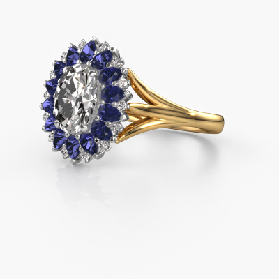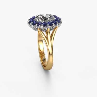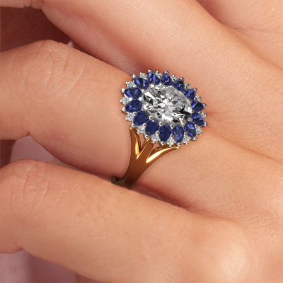 Der oben gezeigte Ring, mit dem Namen Lidia, nennen wir einen Cluster Verlobungsring. Der Cluster Ring trägt einem zentralen Edelstein, umgeben von kleineren Steinen. Diese Version in 14 Karat Gold hat einen oval Lab-grown Diamant von oval als Mittelstein, umschlossen von kleineren Saphir. Was diesen Vintage Gold Cluster Ring besonders macht, sind die kleinen Edelsteine rund um den zentralen Lab-grown Diamant, die wie eine schöne Blume geformt sind. Der umgebende Steinkranz umrahmt den Mittelstein so, dass er größer erscheint. Diese Art von Verlobungsring wird auch Blumen- oder Rosettenring genannt. Es ist sehr wichtig, dass die kleineren Lab grown Diamant identisch positioniert sind, so dass es kein Spiel im Licht, sondern eine perfekte Einheit ergibt. Unsere erfahrenen Juweliere erledigen diese Arbeit. Jeder einzelne Stein wird sorgfältig von Hand gesetzt. Während der Herstellung wird der Lichteinfall ständig überwacht, um sicherzustellen, dass der spezielle Cluster-Effekt noch sichtbar ist. Am Ende bekommen Sie den perfekten Verlobungsring mit einem strahlenden Lab-grown Diamant Edelstein Herzstück. Sie können sich die Wirkung eines solchen Ringes vorstellen, wenn Sie ihn an ihrem besonderen Tag für die Liebe Ihres Lebens zum Leuchten bringen. Jedes Schmuckstück wird hergestellt mit Leidenschaft und Liebe, von einem unserer Meister-Goldschmiede.Durch die Kombination modernster Technik mit uralter Handwerkskunst können wir alle Verlobungsringe in unserem eigenen Studio anfertigen. Jedes Schmuckstück wird auf Anfrage gefertigt. Das ist vorteilhaft, weil wir Ihnen dadurch einen Preis anbieten können, den Sie nirgendwo anders finden.Haben Sie irgendwo einen bestimmten Verlobungsring gefunden, den Sie Ihrem Liebsten schenken möchten? Sie können uns gerne sagen, was Sie wollen und wir werden Ihr Design in einen Einzigartigen Vintage Verlobungsring verwandeln. Sie können die Entwicklungen Ihres Ringdesigns verfolgen, da wir 3D-Zeichnungen verwenden. Das gibt Ihnen eine realistische Vorschau, wie Ihr Design aussehen wird. Sie können auch einen Dummy vorbestellen. Ein Dummy ist ein Kunststoffring, der nach Ihrem Ringdesign gestaltet werden kann. Sie können ihn anprobieren und prüfen, ob seine Breite und Größe für Sie geeignet sind. Wir senden Ihnen gerne ein unverbindliches Angebot zu einem fairen Preis/Leistungsverhältnis. Sie werden in Anbetracht der Qualität des Rings und der Edelsteine überrascht sein.Um es einfacher zu machen, bieten wir eine kostenlose 30-tägige Rücksendung.