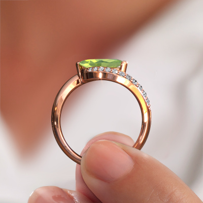 Dieser Verlobungsring aus 585 Roségold heißt Aida MRQ side. Sind Sie auf der Suche nach einem design, Roségold Verlobungsring mit Peridot 11x5.5 mm, den Sie nach Ihren Wünschen gestalten können? Dieser design Verlobungsring ist mit Peridot besetzt, der sorgfältig für diesen speziellen Ring ausgewählt wurde, um den besten Effekt zu erzielen. Unser erfahrener Juwelier kreiert Ihren Ring in unserem eigenen Studio eine Etage tiefer, wo der Peridot mit großer Sorgfalt eingefasst wird. Der Ring wird dann bearbeitet und poliert, bis er perfekt ist. Nichts als das Beste für die Liebe Ihres Lebens! Das Besondere an unserem Konfigurator ist dass Sie selbst einem Schmuckstück zusammenstellen können zu einem eigenen persönlichen Schmuckstück. Jedes Schmuckstück wird hergestellt mit Leidenschaft und Liebe, von einem unserer Meister-Goldschmiede.. Haben Sie ein bestimmtes Budget? Sie können uns gerne kontaktieren, damit wir Ihre Optionen besprechen können. Wir bieten unsere Verlobungsringe zum garantiert besten Preis, denn wir fertigen sie auf Bestellung. Solche Preise finden Sie nirgendwo anders!Unser Team fügt unserer Online-Kollektion täglich neue Designs hinzu. Unsere Designer und Goldschmiede arbeiten zusammen, um das beste Design zu kreieren. Wir bemühen uns, eine vielfältige Kollektion von Schmuckstücken anzubieten. Vielleicht haben Sie ein bestimmtes Design im Sinn. Eines, dass Sie irgendwo gesehen haben. Gerne geben wir Ihnen eine kostenlose Beratung. Wir machen Ihnen ein Angebot, basierend auf einem fairen Preis/Leistungsverhältnis, das Sie verblüffen wird.Um es einfacher zu machen, bieten wir eine kostenlose 30-tägige Rücksendung.