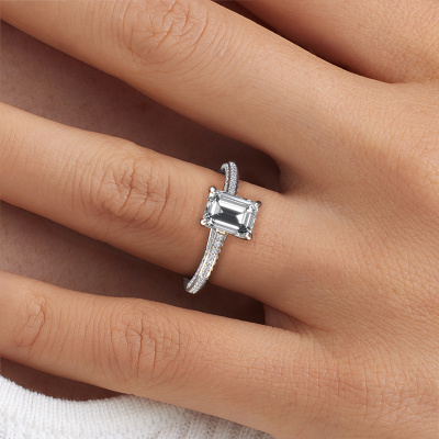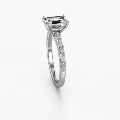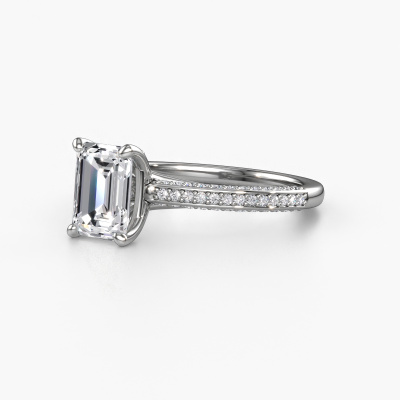 Der oben gezeigte Ring wird Elenore eme genannt. Es ist ein Pavé Solitär Ring, da er einen zentralen Edelstein und ein Band mit Pavé-Fassung hat. Dieser 585 Weißgold ring ist mit einem 1.50 crt smaragd schliff Diamant-Mittelstein besetzt und das Band hat eine Pavé-Fassung mit Lab grown Diamant. Jedes Schmuckstück wird nur für Sie persönlich hergestellt, mit Liebe zum Detail und Design.Dieser exklusive Weißgold Pavé Solitär Verlobungsring mit Pavé-Fassung hat einen exquisiten, smaragd schliff Diamant als Mittelstein. Um den zentralen Stein noch mehr zu betonen, hat das Band eine Pavé-Fassung mit weiteren Lab grown Diamant. Durch die offenen Krappen kann das Licht aus mehreren Winkeln auf den Diamant treffen und der Diamant-Ring funkelt noch mehr. Das obere Foto zeigt die leidenschaftlich handgefertigten Details des Rings. Die hohe Positionierung der Mittelstein ist ein echter Blickfang. Der perfekte Verlobungsring für das Kronjuwel Ihres Lebens!Haben Sie ein bestimmtes Budget? Sie können uns gerne kontaktieren, damit wir Ihre Optionen besprechen können. Wir bieten unsere Verlobungsringe zum garantiert besten Preis, denn wir fertigen sie auf Bestellung. Solche Preise finden Sie nirgendwo anders!Haben Sie irgendwo einen bestimmten Verlobungsring gefunden, den Sie Ihrem Liebsten schenken möchten? Sie können uns gerne sagen, was Sie wollen und wir werden Ihr Design in einen Einzigartigen exklusive Verlobungsring verwandeln. Sie können die Entwicklungen Ihres Ringdesigns verfolgen, da wir 3D-Zeichnungen verwenden. Das gibt Ihnen eine realistische Vorschau, wie Ihr Design aussehen wird. Sie können auch einen Dummy vorbestellen. Ein Dummy ist ein Kunststoffring, der nach Ihrem Ringdesign gestaltet werden kann. Sie können ihn anprobieren und prüfen, ob seine Breite und Größe für Sie geeignet sind. Wir senden Ihnen gerne ein unverbindliches Angebot zu einem fairen Preis/Leistungsverhältnis. Sie werden in Anbetracht der Qualität des Rings und der Edelsteine überrascht sein.Um es einfacher zu machen, bieten wir eine kostenlose 30-tägige Rücksendung.