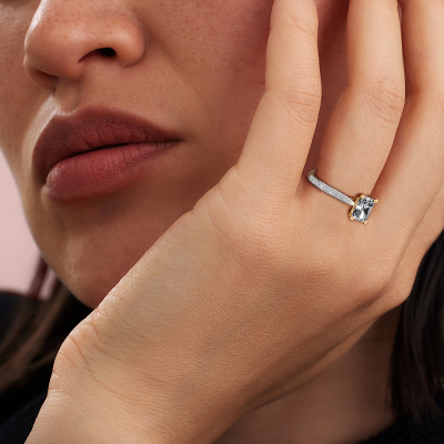 Der oben gezeigte Weißgold Verlobungsring wird Mignon RAD 2 genannt. Es ist ein Pavé Solitär Ring, da er einen zentralen Edelstein und ein Band mit Pavé-Fassung hat. Der traditionell Pavé Solitär Verlobungsring ist in der Kombination 585 Weißgold mit Gold und ist mit einem radiant 1.50 crt Diamant-Mittelstein besetzt und das Band hat eine Pavé-Fassung mit Lab grown Diamant. Jedes Schmuckstück ist einzigartig in jeder Hinsicht! Einfach nach Ihren Wünschen anzupassen. Um den zentralen Stein noch mehr zu betonen, hat das Band eine Pavé-Fassung mit weiteren Diamant. Durch die offenen Krappen kann das Licht aus mehreren Winkeln auf den Diamant treffen und der Diamant-Ring funkelt noch mehr. Das obere Foto zeigt die leidenschaftlich handgefertigten Details des Rings. Die hohe Positionierung der Mittelstein ist ein echter Blickfang. Der perfekte Verlobungsring für das Kronjuwel Ihres Lebens!Haben Sie ein bestimmtes Budget? Sie können uns gerne kontaktieren, damit wir Ihre Optionen besprechen können. Wir bieten unsere Verlobungsringe zum garantiert besten Preis, denn wir fertigen sie auf Bestellung. Solche Preise finden Sie nirgendwo anders!Haben Sie irgendwo einen bestimmten Verlobungsring gefunden, den Sie Ihrem Liebsten schenken möchten? Sie können uns gerne sagen, was Sie wollen und wir werden Ihr Design in einen Einzigartigen traditionell Verlobungsring verwandeln. Sie können die Entwicklungen Ihres Ringdesigns verfolgen, da wir 3D-Zeichnungen verwenden. Das gibt Ihnen eine realistische Vorschau, wie Ihr Design aussehen wird. Sie können auch einen Dummy vorbestellen. Ein Dummy ist ein Kunststoffring, der nach Ihrem Ringdesign gestaltet werden kann. Sie können ihn anprobieren und prüfen, ob seine Breite und Größe für Sie geeignet sind. Wir senden Ihnen gerne ein unverbindliches Angebot zu einem fairen Preis/Leistungsverhältnis. Sie werden in Anbetracht der Qualität des Rings und der Edelsteine überrascht sein.Um es einfacher zu machen, bieten wir eine kostenlose 30-tägige Rücksendung.