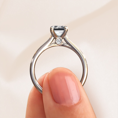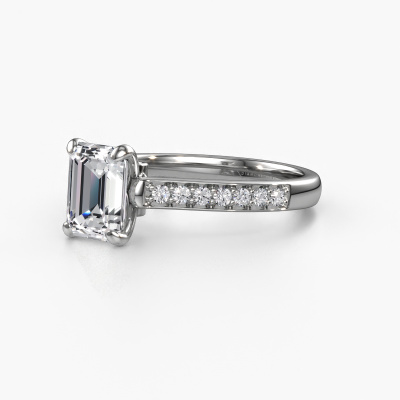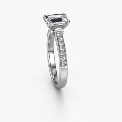 Der oben gezeigte Weißgold Verlobungsring wird Valorie eme 2 genannt. Es ist ein Pavé Solitär Ring, da er einen zentralen Edelstein und ein Band mit Pavé-Fassung hat. Der klassische Pavé Solitär Verlobungsring ist in der Kombination 585 Weißgold mit Weißgold und ist mit einem smaragd schliff 1.50 crt Diamant-Mittelstein besetzt und das Band hat eine Pavé-Fassung mit Diamanten. Jedes Schmuckstück wird hergestellt von einem Team leidenschaftlicher Goldschmiede und Schmuckdesigner. Das wird Ihr Kronjuwel unbedingt zu einem Blickfang machen. Um den zentralen Stein noch mehr zu betonen, hat das Band eine Pavé-Fassung mit weiteren Diamant. Durch die offenen Krappen kann das Licht aus mehreren Winkeln auf den Diamant treffen und der Diamant-Ring funkelt noch mehr. Das obere Foto zeigt die leidenschaftlich handgefertigten Details des Rings. Die hohe Positionierung der Mittelstein ist ein echter Blickfang. Der perfekte Verlobungsring für das Kronjuwel Ihres Lebens!Mit unserer modernen Technik können wir Schmuckstücke von höchster Qualität mit größter Sorgfalt für Sie entwerfen und anpassen. Unsere Verlobungsringe sind immer um 30 Prozent günstiger als bei anderen Juwelieren. Wir fertigen Verlobungsringe auf Bestellung, also müssen wir keine großen Lager unterhalten. Wenn Sie ein bestimmtes Budget haben, beraten wir Sie gerne entsprechend.Haben Sie irgendwo einen bestimmten Verlobungsring gefunden, den Sie Ihrem Liebsten schenken möchten? Sie können uns gerne sagen, was Sie wollen und wir werden Ihr Design in einen Einzigartigen klassische Verlobungsring verwandeln. Sie können die Entwicklungen Ihres Ringdesigns verfolgen, da wir 3D-Zeichnungen verwenden. Das gibt Ihnen eine realistische Vorschau, wie Ihr Design aussehen wird. Sie können auch einen Dummy vorbestellen. Ein Dummy ist ein Kunststoffring, der nach Ihrem Ringdesign gestaltet werden kann. Sie können ihn anprobieren und prüfen, ob seine Breite und Größe für Sie geeignet sind. Wir senden Ihnen gerne ein unverbindliches Angebot zu einem fairen Preis/Leistungsverhältnis. Sie werden in Anbetracht der Qualität des Rings und der Edelsteine überrascht sein.Um es einfacher zu machen, bieten wir eine kostenlose 30-tägige Rücksendung.
