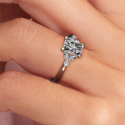Der oben gezeigte Ring wird Megan RAD genannt. Es ist ein Pavé Solitär Ring, da er einen zentralen Edelstein und ein Band mit Pavé-Fassung hat. Dieser 14 Karat Weißgold ring ist mit einem 1.00 crt radiant Diamant-Mittelstein besetzt und das Band hat eine Pavé-Fassung mit Lab grown Diamant. Jedes Schmuckstück wird hergestellt mit Leidenschaft und Liebe, von einem unserer Meister-Goldschmiede.Dieser traditionell Weißgold Pavé Solitär Verlobungsring mit Pavé-Fassung hat einen exquisiten, radiant Diamant als Mittelstein. Um den zentralen Stein noch mehr zu betonen, hat das Band eine Pavé-Fassung mit weiteren Lab grown Diamant. Durch die offenen Krappen kann das Licht aus mehreren Winkeln auf den Diamant treffen und der Diamant-Ring funkelt noch mehr. Das obere Foto zeigt die leidenschaftlich handgefertigten Details des Rings. Die hohe Positionierung der Mittelstein ist ein echter Blickfang. Der perfekte Verlobungsring für das Kronjuwel Ihres Lebens!Mit unserer modernen Technik können wir Schmuckstücke von höchster Qualität mit größter Sorgfalt für Sie entwerfen und anpassen. Unsere Verlobungsringe sind immer um 30 Prozent günstiger als bei anderen Juwelieren. Wir fertigen Verlobungsringe auf Bestellung, also müssen wir keine großen Lager unterhalten. Wenn Sie ein bestimmtes Budget haben, beraten wir Sie gerne entsprechend.Unser Team fügt unserer Online-Kollektion täglich neue Designs hinzu. Unsere Designer und Goldschmiede arbeiten zusammen, um das beste Design zu kreieren. Wir bemühen uns, eine vielfältige Kollektion von Schmuckstücken anzubieten. Vielleicht haben Sie ein bestimmtes Design im Sinn. Eines, dass Sie irgendwo gesehen haben. Gerne geben wir Ihnen eine kostenlose Beratung. Wir machen Ihnen ein Angebot, basierend auf einem fairen Preis/Leistungsverhältnis, das Sie verblüffen wird.Um es einfacher zu machen, bieten wir eine kostenlose 30-tägige Rücksendung.