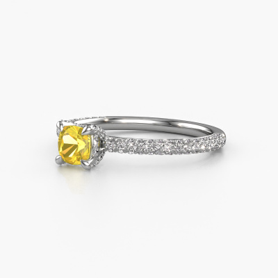 Der oben gezeigte Platin Verlobungsring wird Saskia 2 cus genannt. Es ist ein Pavé Solitär Ring, da er einen zentralen Edelstein und ein Band mit Pavé-Fassung hat. Der moderne Pavé Solitär Verlobungsring ist in der Kombination Platin mit Platin und ist mit einem cussion 4.5 mm Gelb Saphir-Mittelstein besetzt und das Band hat eine Pavé-Fassung mit Lab grown Diamant. Jedes Schmuckstück wird nur für Sie persönlich hergestellt, mit Liebe zum Detail und Design. Um den zentralen Stein noch mehr zu betonen, hat das Band eine Pavé-Fassung mit weiteren Gelb Saphir. Durch die offenen Krappen kann das Licht aus mehreren Winkeln auf den Gelb Saphir treffen und der Gelb Saphir-Ring funkelt noch mehr. Das obere Foto zeigt die leidenschaftlich handgefertigten Details des Rings. Die hohe Positionierung der Mittelstein ist ein echter Blickfang. Der perfekte Verlobungsring für das Kronjuwel Ihres Lebens!Haben Sie ein bestimmtes Budget? Sie können uns gerne kontaktieren, damit wir Ihre Optionen besprechen können. Wir bieten unsere Verlobungsringe zum garantiert besten Preis, denn wir fertigen sie auf Bestellung. Solche Preise finden Sie nirgendwo anders!Unsere Designer und Goldschmiede arbeiten jeden Tag zusammen und versuchen, neue Schmuckstücke zu kreieren. Vielleicht haben Sie irgendwo einen schönen, moderne Verlobungsring gefunden, nach dem Ihr einzigartiger Ring gestaltet werden kann. Setzen Sie sich mit uns in Verbindung. Wir machen Ihnen ein Angebot, basierend auf einem fairen Preis/Leistungsverhältnis, das Sie begeistern wird.Um es einfacher zu machen, bieten wir eine kostenlose 30-tägige Rücksendung.
