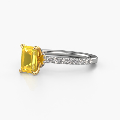 Der oben gezeigte Weißgold Verlobungsring wird Crystal EME 4 genannt. Es ist ein Pavé Solitär Ring, da er einen zentralen Edelstein und ein Band mit Pavé-Fassung hat. Der modische Pavé Solitär Verlobungsring ist in der Kombination 14 Karat Weißgold mit Gold und ist mit einem smaragd schliff 7x5 mm Gelb Saphir-Mittelstein besetzt und das Band hat eine Pavé-Fassung mit Lab grown Diamant. Jedes Schmuckstück ist um Ihrem Finger Glanz zu verleihen. Jeder Ring wird von unseren Goldschmieden liebevoll von Hand gefertigt. Um den zentralen Stein noch mehr zu betonen, hat das Band eine Pavé-Fassung mit weiteren Gelb Saphir. Durch die offenen Krappen kann das Licht aus mehreren Winkeln auf den Gelb Saphir treffen und der Gelb Saphir-Ring funkelt noch mehr. Das obere Foto zeigt die leidenschaftlich handgefertigten Details des Rings. Die hohe Positionierung der Mittelstein ist ein echter Blickfang. Der perfekte Verlobungsring für das Kronjuwel Ihres Lebens!Nach Erhalt Ihrer Bestellung beginnen unsere Goldschmiede mit Leidenschaft den kreativen Prozess und fertigen Ihren Verlobungsring in unserem eigenen Studio. Da wir keine großen Lager haben, werden diese Kosten nicht an Sie weitergegeben. Unsere Preisgestaltung ist der Beweis dafür! Wir bieten Schmuck zum niedrigsten Preis, garantiert.Unser Team fügt unserer Online-Kollektion täglich neue Designs hinzu. Unsere Designer und Goldschmiede arbeiten zusammen, um das beste Design zu kreieren. Wir bemühen uns, eine vielfältige Kollektion von Schmuckstücken anzubieten. Vielleicht haben Sie ein bestimmtes Design im Sinn. Eines, dass Sie irgendwo gesehen haben. Gerne geben wir Ihnen eine kostenlose Beratung. Wir machen Ihnen ein Angebot, basierend auf einem fairen Preis/Leistungsverhältnis, das Sie verblüffen wird.Um es einfacher zu machen, bieten wir eine kostenlose 30-tägige Rücksendung.