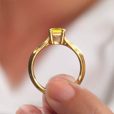 Der oben gezeigte Verlobungsring wird Antonia eme 1 genannt. Wir nennen das einen Solitär-Ring, denn er hat einen einzelnen Edelstein. Es ist ein 14 Karat Gold ring, mit 7x5 mm smaragd schliff Gelb Saphir. Das Besondere an unserem Konfigurator ist dass Sie selbst einem Schmuckstück zusammenstellen können zu einem eigenen persönlichen Schmuckstück. Dieser Solitäre Verlobungsring ist gefertigt in der Edelmetall Kombination Gold mit Gold, aber Sie können also auch wählen aus anderen Farben. Jedes Schmuckstück ist um Ihrem Finger Glanz zu verleihen. Jeder Ring wird von unseren Goldschmieden liebevoll von Hand gefertigt. Der Solitär-Verlobungsring ist eine Sonderform des Verlobungsring. Seine offenen Krappen ermöglichen, dass Licht aus mehr Winkeln auf den Edelstein trifft. Dieser Fantasie Verlobungsring ist durch die hohe Positionierung des Edelsteins ein atemberaubender Blickfang. Wir schmücken diesen Solitär-Ring sorgfältig von Hand, damit Sie Ihren Anfrage mit einem einzigartigen Ring würdigen können. Die Liebe Ihres Lebens verdient nur das Beste. Da wir unsere eigenen Ringe entwerfen und liefern, können wir Ihnen einen Verlobungsring zu einem Preis anbieten, den Sie nirgendwo anders finden. Ein Ring wird auf Bestellung angefertigt, wodurch kein überschüssiges Material anfällt. So können wir Ihnen ein gutes Angebot zum besten Preis machen. Wir verstehen, dass es sich riskant anfühlt, Ihren Verlobungsring online zu kaufen. Jedoch helfen wir Ihnen gerne beim Designprozess unter Berücksichtigung Ihres Budgets.Unsere Designer und Goldschmiede arbeiten jeden Tag zusammen und versuchen, neue Schmuckstücke zu kreieren. Vielleicht haben Sie irgendwo einen schönen, Fantasie Verlobungsring gefunden, nach dem Ihr einzigartiger Ring gestaltet werden kann. Setzen Sie sich mit uns in Verbindung. Wir machen Ihnen ein Angebot, basierend auf einem fairen Preis/Leistungsverhältnis, das Sie begeistern wird.Um es einfacher zu machen, bieten wir eine kostenlose 30-tägige Rücksendung.