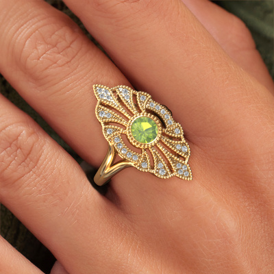 Dieser Verlobungsring aus 14 Karat Gold heißt Hanna. Dieser filigrane Gold Verlobungsring mit 5 mm Peridot ist ein wahres Kunstwerk! Ein wunderschön geschmücktes Design aus komplizierten Drähten. Mit Hingabe, Geduld und äußerster Präzision werden unsere erfahrenen Juweliere einen Ring nur für Sie entwerfen. Die Verzierungen mit kleinen Drähten werden von Hand in Perfektion gefertigt. Das ist ein langwieriger Prozess, der Schweißen, Werkzeug und Polieren umfasst, bis der erfahrene Juwelier mit dem Ergebnis zufrieden ist: Ein perfekter, auffälliger Ring, der ihn mit Freude zum Strahlen bringt. Deshalb ist der Vintage, filigrane Verlobungsring ein außergewöhnliches Geschenk, um die Liebe Ihres Lebens zu verwöhnen. Ein handgemachter, einzigartiger und personalisierter Ring, den man jemandem in diesem besonderen Moment geben kann, wenn man die eine Frage stellt. Ist das nicht wunderbar? Jedes Schmuckstück ist um Ihrem Finger Glanz zu verleihen. Jeder Ring wird von unseren Goldschmieden liebevoll von Hand gefertigt.Nach Erhalt Ihrer Bestellung beginnen unsere Goldschmiede mit Leidenschaft den kreativen Prozess und fertigen Ihren Verlobungsring in unserem eigenen Studio. Da wir keine großen Lager haben, werden diese Kosten nicht an Sie weitergegeben. Unsere Preisgestaltung ist der Beweis dafür! Wir bieten Schmuck zum niedrigsten Preis, garantiert.Unser Team fügt unserer Online-Kollektion täglich neue Designs hinzu. Unsere Designer und Goldschmiede arbeiten zusammen, um das beste Design zu kreieren. Wir bemühen uns, eine vielfältige Kollektion von Schmuckstücken anzubieten. Vielleicht haben Sie ein bestimmtes Design im Sinn. Eines, dass Sie irgendwo gesehen haben. Gerne geben wir Ihnen eine kostenlose Beratung. Wir machen Ihnen ein Angebot, basierend auf einem fairen Preis/Leistungsverhältnis, das Sie verblüffen wird.Um es einfacher zu machen, bieten wir eine kostenlose 30-tägige Rücksendung.