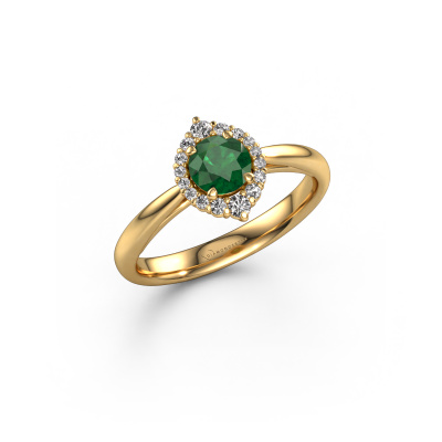 Der oben gezeigte Ring wird Tora genannt. Ein Cluster Ring mit einem zentralen Edelstein, umgeben von kleineren Steinen, wir nennen das einen Cluster Ring. Diese Version in 14 Karat Gold hat einen 5 mm rund Smaragd als Mittelstein, umschlossen von kleineren Lab grown Diamant. Der klassische, Gold Cluster Verlobungsring zeichnet sich durch seine Form aus. Zusammen bilden die kleineren und größeren Smaragd eine Blume und scheinen zu einem großen, funkelnden Edelstein zu verschmelzen. Dieser klassische Verlobungsring wird auch als Blumen- oder Rosettenring bezeichnet. Unsere erfahrenen Juweliere stellen sicher, dass die kleineren Lab grown Diamant identisch gesetzt sind, so dass es an dem Smaragd keine Lichtstörungen gibt, sondern sie stattdessen eine Einheit bilden. Mit perfekter Präzision und geschickter Hand wird jeder Smaragd in den Ring gesetzt. Während der Herstellung wird alles ständig überwacht, um sicherzustellen, dass das Licht einwandfrei reflektiert wird. Das alles führt zu einem einzigartigen Verlobungsring mit einem strahlenden Smaragd in seiner Mitte. Ein schönes, bedeutungsvolles Geschenk, um es der Liebe Ihres Lebens zu schenken. Durch die Kombination modernster Technik mit uralter Handwerkskunst können wir alle Verlobungsringe in unserem eigenen Studio anfertigen. Jedes Schmuckstück wird auf Anfrage gefertigt. Das ist vorteilhaft, weil wir Ihnen dadurch einen Preis anbieten können, den Sie nirgendwo anders finden.Haben Sie irgendwo einen bestimmten Verlobungsring gefunden, den Sie Ihrem Liebsten schenken möchten? Sie können uns gerne sagen, was Sie wollen und wir werden Ihr Design in einen Einzigartigen klassische Verlobungsring verwandeln. Sie können die Entwicklungen Ihres Ringdesigns verfolgen, da wir 3D-Zeichnungen verwenden. Das gibt Ihnen eine realistische Vorschau, wie Ihr Design aussehen wird. Sie können auch einen Dummy vorbestellen. Ein Dummy ist ein Kunststoffring, der nach Ihrem Ringdesign gestaltet werden kann. Sie können ihn anprobieren und prüfen, ob seine Breite und Größe für Sie geeignet sind. Wir senden Ihnen gerne ein unverbindliches Angebot zu einem fairen Preis/Leistungsverhältnis. Sie werden in Anbetracht der Qualität des Rings und der Edelsteine überrascht sein.Um es einfacher zu machen, bieten wir eine kostenlose 30-tägige Rücksendung.