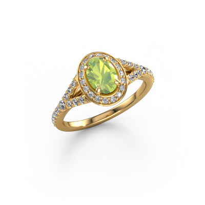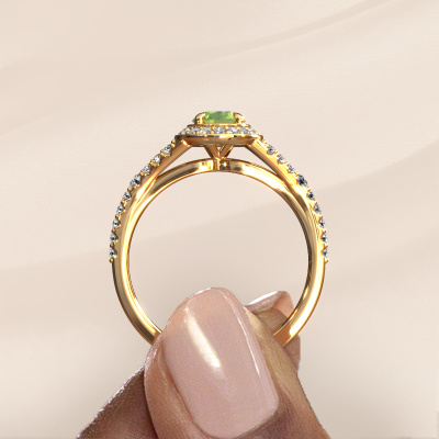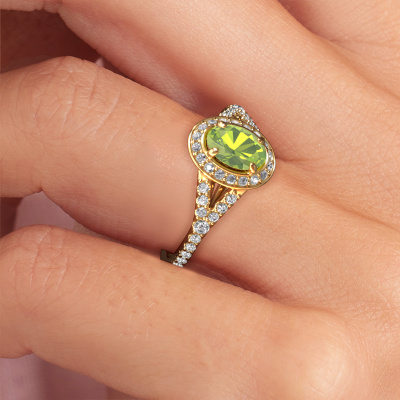 Der oben gezeigte Verlobungsring wird Pamela OVL genannt. Es ist ein Halo Ring, da er einen zentralen Edelstein und ein Band mit Pavé-Fassung hat. Der 14 Karat Gold ring ist mit einem 7x5 mm oval Peridot-Mittelstein besetzt und um ihn herum eine Pavé-Fassung mit Lab grown Diamant. Was diesen Luxus, Gold Halo Ring besonders macht, sind die kleineren Steine, die den zentralen Stein umschließen. Dieser wunderschöne Verlobungsring wird als Halo Ring bezeichnet, da die kleineren Edelsteine dem zentralen Stein einen Lichthof geben. Damit die kleineren Steine den Mittelstein verstärken, müssen sie so platziert werden, dass keine Lichteinflüsse auftreten. Und hier kommen unsere erfahrenen Goldschmiede ins Spiel. Jeder einzelne Stein wird sorgfältig von Hand in den Ring gesetzt. Während der Herstellung wird der Lichteinfall ständig überprüft. So können wir sicherstellen, dass der spezielle Lichtkranz noch sichtbar ist. Am Ende erhalten Sie einen einzigartigen Verlobungsring mit einem Peridot Ihrer Wahl in der Mitte. Sie können sich die Wirkung eines solchen Ringes vorstellen, wenn Sie ihn an ihrem besonderen Tag für sie zum Leuchten bringen. Mit unserer modernen Technik können wir Schmuckstücke von höchster Qualität mit größter Sorgfalt für Sie entwerfen und anpassen. Unsere Verlobungsringe sind immer um 30 Prozent günstiger als bei anderen Juwelieren. Wir fertigen Verlobungsringe auf Bestellung, also müssen wir keine großen Lager unterhalten. Wenn Sie ein bestimmtes Budget haben, beraten wir Sie gerne entsprechend.Unser Team fügt unserer Online-Kollektion täglich neue Designs hinzu. Unsere Designer und Goldschmiede arbeiten zusammen, um das beste Design zu kreieren. Wir bemühen uns, eine vielfältige Kollektion von Schmuckstücken anzubieten. Vielleicht haben Sie ein bestimmtes Design im Sinn. Eines, dass Sie irgendwo gesehen haben. Gerne geben wir Ihnen eine kostenlose Beratung. Wir machen Ihnen ein Angebot, basierend auf einem fairen Preis/Leistungsverhältnis, das Sie verblüffen wird.Um es einfacher zu machen, bieten wir eine kostenlose 30-tägige Rücksendung.