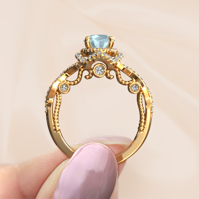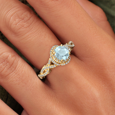 Der oben gezeigte Verlobungsring wird Leora genannt. Es ist ein Halo Ring, da er einen zentralen Edelstein und ein Band mit Pavé-Fassung hat. Der 14 Karat Gold ring ist mit einem 6.5 mm rund Aquamarin-Mittelstein besetzt und um ihn herum eine Pavé-Fassung mit Lab grown Diamant. Was diesen Vintage, Gold Halo Ring besonders macht, sind die kleineren Steine, die den zentralen Stein umschließen. Dieser wunderschöne Verlobungsring wird als Halo Ring bezeichnet, da die kleineren Edelsteine dem zentralen Stein einen Lichthof geben. Damit die kleineren Steine den Mittelstein verstärken, müssen sie so platziert werden, dass keine Lichteinflüsse auftreten. Und hier kommen unsere erfahrenen Goldschmiede ins Spiel. Jeder einzelne Stein wird sorgfältig von Hand in den Ring gesetzt. Während der Herstellung wird der Lichteinfall ständig überprüft. So können wir sicherstellen, dass der spezielle Lichtkranz noch sichtbar ist. Am Ende erhalten Sie einen einzigartigen Verlobungsring mit einem Aquamarins Ihrer Wahl in der Mitte. Sie können sich die Wirkung eines solchen Ringes vorstellen, wenn Sie ihn an ihrem besonderen Tag für sie zum Leuchten bringen. Mit unserer modernen Technik können wir Schmuckstücke von höchster Qualität mit größter Sorgfalt für Sie entwerfen und anpassen. Unsere Verlobungsringe sind immer um 30 Prozent günstiger als bei anderen Juwelieren. Wir fertigen Verlobungsringe auf Bestellung, also müssen wir keine großen Lager unterhalten. Wenn Sie ein bestimmtes Budget haben, beraten wir Sie gerne entsprechend.Unsere Designer und Goldschmiede arbeiten jeden Tag zusammen und versuchen, neue Schmuckstücke zu kreieren. Vielleicht haben Sie irgendwo einen schönen, Vintage Verlobungsring gefunden, nach dem Ihr einzigartiger Ring gestaltet werden kann. Setzen Sie sich mit uns in Verbindung. Wir machen Ihnen ein Angebot, basierend auf einem fairen Preis/Leistungsverhältnis, das Sie begeistern wird.Um es einfacher zu machen, bieten wir eine kostenlose 30-tägige Rücksendung.