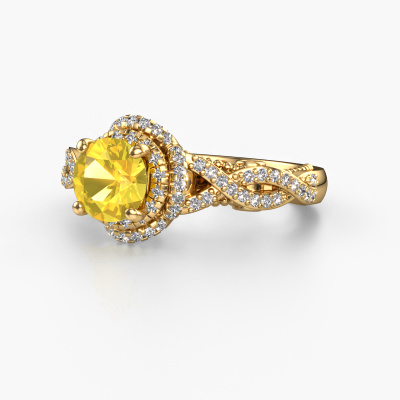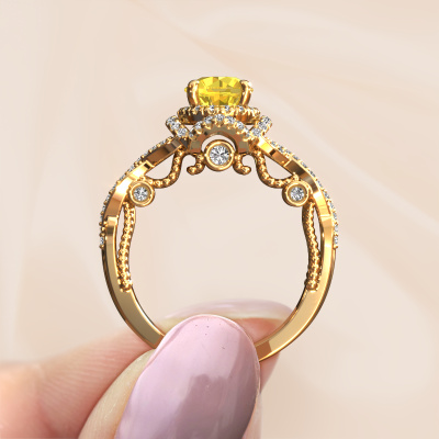 Der oben gezeigte Verlobungsring wird Leora genannt. Es ist ein Halo Ring, da er einen zentralen Edelstein und ein Band mit Pavé-Fassung hat. Der 14 Karat Gold ring ist mit einem 6.5 mm rund Gelb Saphir-Mittelstein besetzt und um ihn herum eine Pavé-Fassung mit Lab grown Diamant. Was diesen Vintage, Gold Halo Ring besonders macht, sind die kleineren Steine, die den zentralen Stein umschließen. Dieser wunderschöne Verlobungsring wird als Halo Ring bezeichnet, da die kleineren Edelsteine dem zentralen Stein einen Lichthof geben. Damit die kleineren Steine den Mittelstein verstärken, müssen sie so platziert werden, dass keine Lichteinflüsse auftreten. Und hier kommen unsere erfahrenen Goldschmiede ins Spiel. Jeder einzelne Stein wird sorgfältig von Hand in den Ring gesetzt. Während der Herstellung wird der Lichteinfall ständig überprüft. So können wir sicherstellen, dass der spezielle Lichtkranz noch sichtbar ist. Am Ende erhalten Sie einen einzigartigen Verlobungsring mit einem Gelb Saphir Ihrer Wahl in der Mitte. Sie können sich die Wirkung eines solchen Ringes vorstellen, wenn Sie ihn an ihrem besonderen Tag für sie zum Leuchten bringen. Mit unserer modernen Technik können wir Schmuckstücke von höchster Qualität mit größter Sorgfalt für Sie entwerfen und anpassen. Unsere Verlobungsringe sind immer um 30 Prozent günstiger als bei anderen Juwelieren. Wir fertigen Verlobungsringe auf Bestellung, also müssen wir keine großen Lager unterhalten. Wenn Sie ein bestimmtes Budget haben, beraten wir Sie gerne entsprechend.Unsere Designer und Goldschmiede arbeiten jeden Tag zusammen und versuchen, neue Schmuckstücke zu kreieren. Vielleicht haben Sie irgendwo einen schönen, Vintage Verlobungsring gefunden, nach dem Ihr einzigartiger Ring gestaltet werden kann. Setzen Sie sich mit uns in Verbindung. Wir machen Ihnen ein Angebot, basierend auf einem fairen Preis/Leistungsverhältnis, das Sie begeistern wird.Um es einfacher zu machen, bieten wir eine kostenlose 30-tägige Rücksendung.