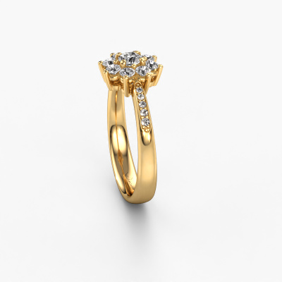 Der oben gezeigte Ring wird Camille 2 genannt. Ein Flower Ring mit einem zentralen Edelstein, umgeben von kleineren Steinen, wir nennen das einen Cluster Ring. Diese Version in 14 Karat Gold hat einen 0.15 crt rund Lab-grown Diamant als Mittelstein, umschlossen von kleineren Diamanten. Wenn Sie einen Gold Flower Verlobungsring sehen, werden Sie vielleicht den Eindruck bekommen, dass seine kleineren Steine mit dem größeren Lab-grown Diamant aufeinanderprallen. Deshalb ist er wie eine Blume geformt. Deshalb ist dieser Verlobungsring auch als Blumen- oder Rosetten Fassung bekannt. Es ist sehr wichtig, dass die kleineren Diamanten identisch positioniert sind, so dass es kein Spiel im Licht, sondern eine perfekte Einheit ergibt. Unsere erfahrenen Juweliere erledigen diese Arbeit. Jeder einzelne Stein wird sorgfältig von Hand gesetzt. Während der Herstellung wird der Lichteinfall ständig überwacht. Am Ende bekommen Sie den perfekten Verlobungsring mit einem strahlenden Lab-grown Diamant Edelstein Herzstück. Sie können sich die Wirkung eines solchen Ringes vorstellen, wenn Sie ihn an ihrem besonderen Tag für die Liebe Ihres Lebens zum Leuchten bringen. Da wir unsere eigenen Ringe entwerfen und liefern, können wir Ihnen einen Verlobungsring zu einem Preis anbieten, den Sie nirgendwo anders finden. Ein Ring wird auf Bestellung angefertigt, wodurch kein überschüssiges Material anfällt. So können wir Ihnen ein gutes Angebot zum besten Preis machen. Wir verstehen, dass es sich riskant anfühlt, Ihren Verlobungsring online zu kaufen. Jedoch helfen wir Ihnen gerne beim Designprozess unter Berücksichtigung Ihres Budgets.Unser Team fügt unserer Online-Kollektion täglich neue Designs hinzu. Unsere Designer und Goldschmiede arbeiten zusammen, um das beste Design zu kreieren. Wir bemühen uns, eine vielfältige Kollektion von Schmuckstücken anzubieten. Vielleicht haben Sie ein bestimmtes Design im Sinn. Eines, dass Sie irgendwo gesehen haben. Gerne geben wir Ihnen eine kostenlose Beratung. Wir machen Ihnen ein Angebot, basierend auf einem fairen Preis/Leistungsverhältnis, das Sie verblüffen wird.Um es einfacher zu machen, bieten wir eine kostenlose 30-tägige Rücksendung.