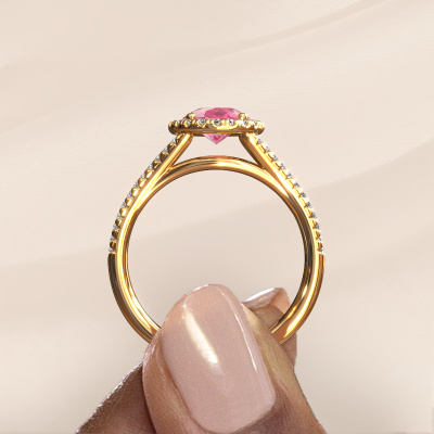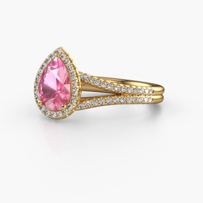 Der oben gezeigte Verlobungsring wird Verla pear 2 genannt. Es ist ein Halo Ring, da er einen zentralen Edelstein und ein Band mit Pavé-Fassung hat. Der 14 Karat Gold ring ist mit einem 8x6 mm tropfen Pink Saphir-Mittelstein besetzt und um ihn herum eine Pavé-Fassung mit Diamanten. Was diesen exklusive, Gold Halo Ring besonders macht, sind die kleineren Steine, die den zentralen Stein umschließen. Dieser wunderschöne Verlobungsring wird als Halo Ring bezeichnet, da die kleineren Edelsteine dem zentralen Stein einen Lichthof geben. Damit die kleineren Steine den Mittelstein verstärken, müssen sie so platziert werden, dass keine Lichteinflüsse auftreten. Und hier kommen unsere erfahrenen Goldschmiede ins Spiel. Jeder einzelne Stein wird sorgfältig von Hand in den Ring gesetzt. Während der Herstellung wird der Lichteinfall ständig überprüft. So können wir sicherstellen, dass der spezielle Lichtkranz noch sichtbar ist. Am Ende erhalten Sie einen einzigartigen Verlobungsring mit einem Pink Saphir Ihrer Wahl in der Mitte. Sie können sich die Wirkung eines solchen Ringes vorstellen, wenn Sie ihn an ihrem besonderen Tag für sie zum Leuchten bringen. Nach Erhalt Ihrer Bestellung beginnen unsere Goldschmiede mit Leidenschaft den kreativen Prozess und fertigen Ihren Verlobungsring in unserem eigenen Studio. Da wir keine großen Lager haben, werden diese Kosten nicht an Sie weitergegeben. Unsere Preisgestaltung ist der Beweis dafür! Wir bieten Schmuck zum niedrigsten Preis, garantiert.Unsere Designer und Goldschmiede arbeiten jeden Tag zusammen und versuchen, neue Schmuckstücke zu kreieren. Vielleicht haben Sie irgendwo einen schönen, exklusive Verlobungsring gefunden, nach dem Ihr einzigartiger Ring gestaltet werden kann. Setzen Sie sich mit uns in Verbindung. Wir machen Ihnen ein Angebot, basierend auf einem fairen Preis/Leistungsverhältnis, das Sie begeistern wird.Um es einfacher zu machen, bieten wir eine kostenlose 30-tägige Rücksendung.
