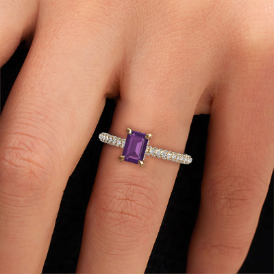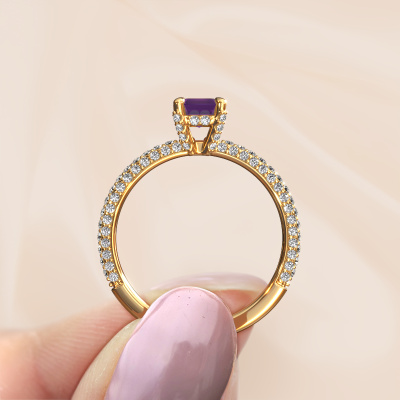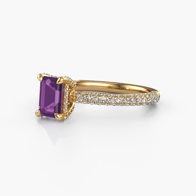 Der oben gezeigte Gold Verlobungsring wird Saskia eme 2 genannt. Es ist ein Pavé Solitär Ring, da er einen zentralen Edelstein und ein Band mit Pavé-Fassung hat. Der exklusive Pavé Solitär Verlobungsring ist in der Kombination 14 Karat Gold mit Gold und ist mit einem smaragd schliff 6.5x4.5 mm Amethyst-Mittelstein besetzt und das Band hat eine Pavé-Fassung mit Diamanten. Jedes Schmuckstück wird hergestellt von einem Team leidenschaftlicher Goldschmiede und Schmuckdesigner. Das wird Ihr Kronjuwel unbedingt zu einem Blickfang machen. Um den zentralen Stein noch mehr zu betonen, hat das Band eine Pavé-Fassung mit weiteren Amethyst. Durch die offenen Krappen kann das Licht aus mehreren Winkeln auf den Amethyst treffen und der Amethyst-Ring funkelt noch mehr. Das obere Foto zeigt die leidenschaftlich handgefertigten Details des Rings. Die hohe Positionierung der Mittelstein ist ein echter Blickfang. Der perfekte Verlobungsring für das Kronjuwel Ihres Lebens!Mit unserer modernen Technik können wir Schmuckstücke von höchster Qualität mit größter Sorgfalt für Sie entwerfen und anpassen. Unsere Verlobungsringe sind immer um 30 Prozent günstiger als bei anderen Juwelieren. Wir fertigen Verlobungsringe auf Bestellung, also müssen wir keine großen Lager unterhalten. Wenn Sie ein bestimmtes Budget haben, beraten wir Sie gerne entsprechend.Verschiedene Arten von neuen Ringen werden täglich von unserem Team angefertigt. Vielleicht haben Sie irgendwo einen Pavé Solitär Verlobungsring gefunden. Einen, den Sie Ihrem Liebsten schenken möchten. Bitte zögern Sie nicht, unseren Schmuckdesignern Ihre Gedanken und Ihr Design zu zeigen. Wir würden gerne Ihr Design in einen exklusive Verlobungsring verwandeln. Sie können die Entwicklungen Ihres Ringdesigns verfolgen, da wir sehr detaillierte 3D-Zeichnungen verwenden. Darüber hinaus können Sie einen Dummy des Designs bestellen. Ein Dummy ist ein Kunststoffring, der nach Ihrem Ringdesign gestaltet werden kann. Sie können ihn anprobieren und prüfen, ob der Verlobungsring Ihren Vorstellungen entspricht. Wir senden Ihnen gerne ein unverbindliches Angebot zu einem fairen Preis/Leistungsverhältnis. Das Angebot wird Sie angesichts der Qualität des Rings und der Edelsteine verblüffen.Um es einfacher zu machen, bieten wir eine kostenlose 30-tägige Rücksendung.