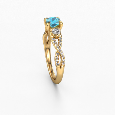 Der oben gezeigte Gold Verlobungsring wird Marilou CUS genannt. Es ist ein 3-stone Ring, da er einen zentralen Edelstein und ein Band mit Pavé-Fassung hat. Der traditionell 3-stone Verlobungsring ist in der Kombination 14 Karat Gold mit Gold und ist mit einem cussion 5 mm Blau Topas-Mittelstein besetzt und das Band hat eine Pavé-Fassung mit Diamanten. Jedes Schmuckstück ist einzigartig in jeder Hinsicht! Einfach nach Ihren Wünschen anzupassen. Um den zentralen Stein noch mehr zu betonen, hat das Band eine Pavé-Fassung mit weiteren Blau Topas. Durch die offenen Krappen kann das Licht aus mehreren Winkeln auf den Blau Topas treffen und der Blau Topas-Ring funkelt noch mehr. Das obere Foto zeigt die leidenschaftlich handgefertigten Details des Rings. Die hohe Positionierung der Mittelstein ist ein echter Blickfang. Der perfekte Verlobungsring für das Kronjuwel Ihres Lebens!Durch die Kombination modernster Technik mit uralter Handwerkskunst können wir alle Verlobungsringe in unserem eigenen Studio anfertigen. Jedes Schmuckstück wird auf Anfrage gefertigt. Das ist vorteilhaft, weil wir Ihnen dadurch einen Preis anbieten können, den Sie nirgendwo anders finden.Unser Team fügt unserer Online-Kollektion täglich neue Designs hinzu. Unsere Designer und Goldschmiede arbeiten zusammen, um das beste Design zu kreieren. Wir bemühen uns, eine vielfältige Kollektion von Schmuckstücken anzubieten. Vielleicht haben Sie ein bestimmtes Design im Sinn. Eines, dass Sie irgendwo gesehen haben. Gerne geben wir Ihnen eine kostenlose Beratung. Wir machen Ihnen ein Angebot, basierend auf einem fairen Preis/Leistungsverhältnis, das Sie verblüffen wird.Um es einfacher zu machen, bieten wir eine kostenlose 30-tägige Rücksendung.