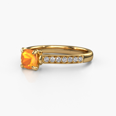 Der oben gezeigte Gold Verlobungsring wird Valorie cus 2 genannt. Es ist ein Pavé Solitär Ring, da er einen zentralen Edelstein und ein Band mit Pavé-Fassung hat. Der traditionell Pavé Solitär Verlobungsring ist in der Kombination 14 Karat Gold mit Gold und ist mit einem cussion 5.5 mm Citrin-Mittelstein besetzt und das Band hat eine Pavé-Fassung mit Diamanten. Jedes Schmuckstück wird von unseren Meister-Goldschmieden in unserem eigenen Studio für Sie gefertigt. Um den zentralen Stein noch mehr zu betonen, hat das Band eine Pavé-Fassung mit weiteren Citrin. Durch die offenen Krappen kann das Licht aus mehreren Winkeln auf den Citrin treffen und der Citrin-Ring funkelt noch mehr. Das obere Foto zeigt die leidenschaftlich handgefertigten Details des Rings. Die hohe Positionierung der Mittelstein ist ein echter Blickfang. Der perfekte Verlobungsring für das Kronjuwel Ihres Lebens!Durch die Kombination modernster Technik mit uralter Handwerkskunst können wir alle Verlobungsringe in unserem eigenen Studio anfertigen. Jedes Schmuckstück wird auf Anfrage gefertigt. Das ist vorteilhaft, weil wir Ihnen dadurch einen Preis anbieten können, den Sie nirgendwo anders finden.Unsere Designer und Goldschmiede arbeiten jeden Tag zusammen und versuchen, neue Schmuckstücke zu kreieren. Vielleicht haben Sie irgendwo einen schönen, traditionell Verlobungsring gefunden, nach dem Ihr einzigartiger Ring gestaltet werden kann. Setzen Sie sich mit uns in Verbindung. Wir machen Ihnen ein Angebot, basierend auf einem fairen Preis/Leistungsverhältnis, das Sie begeistern wird.Um es einfacher zu machen, bieten wir eine kostenlose 30-tägige Rücksendung.