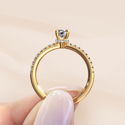 Der oben gezeigte Gold Verlobungsring wird Crystal rnd 4 genannt. Es ist ein Pavé Solitär Ring, da er einen zentralen Edelstein und ein Band mit Pavé-Fassung hat. Der Fantasie Pavé Solitär Verlobungsring ist in der Kombination 585 Gold mit Gold und ist mit einem rund 0.40 crt Diamant-Mittelstein besetzt und das Band hat eine Pavé-Fassung mit Lab grown Diamant. Jedes Schmuckstück lässt Ihren Finger erstrahlen. Ihr Ring ist mit Liebe von unseren Goldschmieden handgefertigt. Um den zentralen Stein noch mehr zu betonen, hat das Band eine Pavé-Fassung mit weiteren Diamant. Durch die offenen Krappen kann das Licht aus mehreren Winkeln auf den Diamant treffen und der Diamant-Ring funkelt noch mehr. Das obere Foto zeigt die leidenschaftlich handgefertigten Details des Rings. Die hohe Positionierung der Mittelstein ist ein echter Blickfang. Der perfekte Verlobungsring für das Kronjuwel Ihres Lebens!Mit unserer modernen Technik können wir Schmuckstücke von höchster Qualität mit größter Sorgfalt für Sie entwerfen und anpassen. Unsere Verlobungsringe sind immer um 30 Prozent günstiger als bei anderen Juwelieren. Wir fertigen Verlobungsringe auf Bestellung, also müssen wir keine großen Lager unterhalten. Wenn Sie ein bestimmtes Budget haben, beraten wir Sie gerne entsprechend.Haben Sie irgendwo einen bestimmten Verlobungsring gefunden, den Sie Ihrem Liebsten schenken möchten? Sie können uns gerne sagen, was Sie wollen und wir werden Ihr Design in einen Einzigartigen Fantasie Verlobungsring verwandeln. Sie können die Entwicklungen Ihres Ringdesigns verfolgen, da wir 3D-Zeichnungen verwenden. Das gibt Ihnen eine realistische Vorschau, wie Ihr Design aussehen wird. Sie können auch einen Dummy vorbestellen. Ein Dummy ist ein Kunststoffring, der nach Ihrem Ringdesign gestaltet werden kann. Sie können ihn anprobieren und prüfen, ob seine Breite und Größe für Sie geeignet sind. Wir senden Ihnen gerne ein unverbindliches Angebot zu einem fairen Preis/Leistungsverhältnis. Sie werden in Anbetracht der Qualität des Rings und der Edelsteine überrascht sein.Um es einfacher zu machen, bieten wir eine kostenlose 30-tägige Rücksendung.