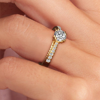 Der oben gezeigte Gold Verlobungsring wird Rozella genannt. Es ist ein Pavé Solitär Ring, da er einen zentralen Edelstein und ein Band mit Pavé-Fassung hat. Der einzigartige Pavé Solitär Verlobungsring ist in der Kombination 14 Karat Gold mit Gold und ist mit einem rund 0.60 crt Lab-grown Diamant-Mittelstein besetzt und das Band hat eine Pavé-Fassung mit Lab grown Diamant. Jedes Schmuckstück lässt Ihren Finger erstrahlen. Ihr Ring ist mit Liebe von unseren Goldschmieden handgefertigt. Um den zentralen Stein noch mehr zu betonen, hat das Band eine Pavé-Fassung mit weiteren Lab-grown Diamant. Durch die offenen Krappen kann das Licht aus mehreren Winkeln auf den Lab-grown Diamant treffen und der Lab-grown Diamant-Ring funkelt noch mehr. Das obere Foto zeigt die leidenschaftlich handgefertigten Details des Rings. Die hohe Positionierung der Mittelstein ist ein echter Blickfang. Der perfekte Verlobungsring für das Kronjuwel Ihres Lebens!Nachdem Sie Ihre Bestellung aufgegeben haben, beginnen unsere Goldschmiede mit dem kreativen Prozess der Herstellung Ihres Rozella Verlobungsring. Wir haben keine Lager. Das ist vorteilhaft, da diese Kosten nicht an Sie weitergegeben werden. Daher sind wir in der Lage, Schmuck zu außergewöhnlich niedrigen Preisen anzubieten.Unsere Designer und Goldschmiede arbeiten jeden Tag zusammen und versuchen, neue Schmuckstücke zu kreieren. Vielleicht haben Sie irgendwo einen schönen, einzigartige Verlobungsring gefunden, nach dem Ihr einzigartiger Ring gestaltet werden kann. Setzen Sie sich mit uns in Verbindung. Wir machen Ihnen ein Angebot, basierend auf einem fairen Preis/Leistungsverhältnis, das Sie begeistern wird.Um es einfacher zu machen, bieten wir eine kostenlose 30-tägige Rücksendung.