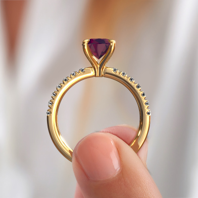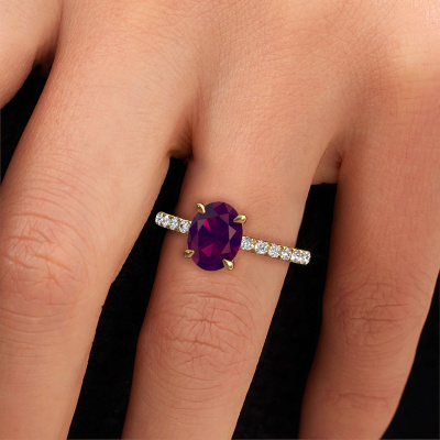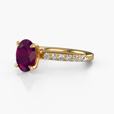 Der oben gezeigte Gold Verlobungsring wird Crystal OVL 2 genannt. Es ist ein Pavé Solitär Ring, da er einen zentralen Edelstein und ein Band mit Pavé-Fassung hat. Der exklusive Pavé Solitär Verlobungsring ist in der Kombination 14 Karat Gold mit Gold und ist mit einem oval 9x7 mm Rhodolit-Mittelstein besetzt und das Band hat eine Pavé-Fassung mit Lab grown Diamant. Jedes Schmuckstück wird von unseren Meister-Goldschmieden in unserem eigenen Studio für Sie gefertigt. Um den zentralen Stein noch mehr zu betonen, hat das Band eine Pavé-Fassung mit weiteren Rhodolit. Durch die offenen Krappen kann das Licht aus mehreren Winkeln auf den Rhodolit treffen und der Rhodolit-Ring funkelt noch mehr. Das obere Foto zeigt die leidenschaftlich handgefertigten Details des Rings. Die hohe Positionierung der Mittelstein ist ein echter Blickfang. Der perfekte Verlobungsring für das Kronjuwel Ihres Lebens!Durch die Kombination modernster Technik mit uralter Handwerkskunst können wir alle Verlobungsringe in unserem eigenen Studio anfertigen. Jedes Schmuckstück wird auf Anfrage gefertigt. Das ist vorteilhaft, weil wir Ihnen dadurch einen Preis anbieten können, den Sie nirgendwo anders finden.Unser Team fügt unserer Online-Kollektion täglich neue Designs hinzu. Unsere Designer und Goldschmiede arbeiten zusammen, um das beste Design zu kreieren. Wir bemühen uns, eine vielfältige Kollektion von Schmuckstücken anzubieten. Vielleicht haben Sie ein bestimmtes Design im Sinn. Eines, dass Sie irgendwo gesehen haben. Gerne geben wir Ihnen eine kostenlose Beratung. Wir machen Ihnen ein Angebot, basierend auf einem fairen Preis/Leistungsverhältnis, das Sie verblüffen wird.Um es einfacher zu machen, bieten wir eine kostenlose 30-tägige Rücksendung.