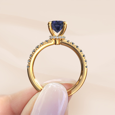 Der oben gezeigte Gold Verlobungsring wird Crystal rnd 4 genannt. Es ist ein Pavé Solitär Ring, da er einen zentralen Edelstein und ein Band mit Pavé-Fassung hat. Der Fantasie Pavé Solitär Verlobungsring ist in der Kombination 14 Karat Gold mit Gold und ist mit einem rund 7 mm Saphir-Mittelstein besetzt und das Band hat eine Pavé-Fassung mit Lab grown Diamant. Jedes Schmuckstück lässt Ihren Finger erstrahlen. Ihr Ring ist mit Liebe von unseren Goldschmieden handgefertigt. Um den zentralen Stein noch mehr zu betonen, hat das Band eine Pavé-Fassung mit weiteren Saphir. Durch die offenen Krappen kann das Licht aus mehreren Winkeln auf den Saphir treffen und der Saphir-Ring funkelt noch mehr. Das obere Foto zeigt die leidenschaftlich handgefertigten Details des Rings. Die hohe Positionierung der Mittelstein ist ein echter Blickfang. Der perfekte Verlobungsring für das Kronjuwel Ihres Lebens!Mit unserer modernen Technik können wir Schmuckstücke von höchster Qualität mit größter Sorgfalt für Sie entwerfen und anpassen. Unsere Verlobungsringe sind immer um 30 Prozent günstiger als bei anderen Juwelieren. Wir fertigen Verlobungsringe auf Bestellung, also müssen wir keine großen Lager unterhalten. Wenn Sie ein bestimmtes Budget haben, beraten wir Sie gerne entsprechend.Haben Sie irgendwo einen bestimmten Verlobungsring gefunden, den Sie Ihrem Liebsten schenken möchten? Sie können uns gerne sagen, was Sie wollen und wir werden Ihr Design in einen Einzigartigen Fantasie Verlobungsring verwandeln. Sie können die Entwicklungen Ihres Ringdesigns verfolgen, da wir 3D-Zeichnungen verwenden. Das gibt Ihnen eine realistische Vorschau, wie Ihr Design aussehen wird. Sie können auch einen Dummy vorbestellen. Ein Dummy ist ein Kunststoffring, der nach Ihrem Ringdesign gestaltet werden kann. Sie können ihn anprobieren und prüfen, ob seine Breite und Größe für Sie geeignet sind. Wir senden Ihnen gerne ein unverbindliches Angebot zu einem fairen Preis/Leistungsverhältnis. Sie werden in Anbetracht der Qualität des Rings und der Edelsteine überrascht sein.Um es einfacher zu machen, bieten wir eine kostenlose 30-tägige Rücksendung.