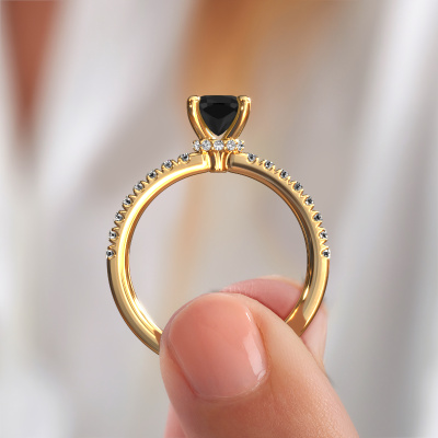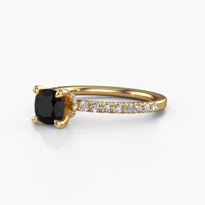 Der oben gezeigte Gold Verlobungsring wird Crystal CUS 4 genannt. Es ist ein Pavé Solitär Ring, da er einen zentralen Edelstein und ein Band mit Pavé-Fassung hat. Der schicke Pavé Solitär Verlobungsring ist in der Kombination 14 Karat Gold mit Gold und ist mit einem cussion 1.15 crt Schwarz Diamant-Mittelstein besetzt und das Band hat eine Pavé-Fassung mit Diamanten. Jedes Schmuckstück ist um Ihrem Finger Glanz zu verleihen. Jeder Ring wird von unseren Goldschmieden liebevoll von Hand gefertigt. Um den zentralen Stein noch mehr zu betonen, hat das Band eine Pavé-Fassung mit weiteren Schwarz Diamant. Durch die offenen Krappen kann das Licht aus mehreren Winkeln auf den Schwarz Diamant treffen und der Schwarz Diamant-Ring funkelt noch mehr. Das obere Foto zeigt die leidenschaftlich handgefertigten Details des Rings. Die hohe Positionierung der Mittelstein ist ein echter Blickfang. Der perfekte Verlobungsring für das Kronjuwel Ihres Lebens!Mit unserer modernen Technik können wir Schmuckstücke von höchster Qualität mit größter Sorgfalt für Sie entwerfen und anpassen. Unsere Verlobungsringe sind immer um 30 Prozent günstiger als bei anderen Juwelieren. Wir fertigen Verlobungsringe auf Bestellung, also müssen wir keine großen Lager unterhalten. Wenn Sie ein bestimmtes Budget haben, beraten wir Sie gerne entsprechend.Haben Sie einen bestimmten Ring im Sinn? Eines, dass Sie irgendwo gesehen haben. Bitte zögern Sie nicht, uns zu sagen, was Sie wollen und wir werden Ihr Design in einen Einzigartigen Verlobungsring verwandeln. Sie können die Entwicklungen Ihres Ringdesigns verfolgen, da wir 3D-Zeichnungen verwenden. Das gibt Ihnen eine realistische Vorschau Ihres Designs. Wir senden Ihnen gerne ein unverbindliches Angebot zu einem fairen Preis/Leistungsverhältnis. Es wird Sie erstaunen.Um es einfacher zu machen, bieten wir eine kostenlose 30-tägige Rücksendung.