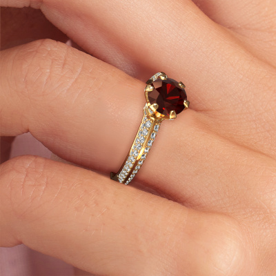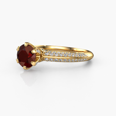 Der oben gezeigte Gold Verlobungsring wird Abby genannt. Es ist ein Pavé Solitär Ring, da er einen zentralen Edelstein und ein Band mit Pavé-Fassung hat. Der exklusive Pavé Solitär Verlobungsring ist in der Kombination 14 Karat Gold mit Gold und ist mit einem rund 6.5 mm Granat-Mittelstein besetzt und das Band hat eine Pavé-Fassung mit Diamanten. Jedes Schmuckstück wird von unseren Meister-Goldschmieden in unserem eigenen Studio für Sie gefertigt. Um den zentralen Stein noch mehr zu betonen, hat das Band eine Pavé-Fassung mit weiteren Granat. Durch die offenen Krappen kann das Licht aus mehreren Winkeln auf den Granat treffen und der Granat-Ring funkelt noch mehr. Das obere Foto zeigt die leidenschaftlich handgefertigten Details des Rings. Die hohe Positionierung der Mittelstein ist ein echter Blickfang. Der perfekte Verlobungsring für das Kronjuwel Ihres Lebens!Haben Sie ein bestimmtes Budget? Sie können uns gerne kontaktieren, damit wir Ihre Optionen besprechen können. Wir bieten unsere Verlobungsringe zum garantiert besten Preis, denn wir fertigen sie auf Bestellung. Solche Preise finden Sie nirgendwo anders!Unser Team fügt unserer Online-Kollektion täglich neue Designs hinzu. Unsere Designer und Goldschmiede arbeiten zusammen, um das beste Design zu kreieren. Wir bemühen uns, eine vielfältige Kollektion von Schmuckstücken anzubieten. Vielleicht haben Sie ein bestimmtes Design im Sinn. Eines, dass Sie irgendwo gesehen haben. Gerne geben wir Ihnen eine kostenlose Beratung. Wir machen Ihnen ein Angebot, basierend auf einem fairen Preis/Leistungsverhältnis, das Sie verblüffen wird.Um es einfacher zu machen, bieten wir eine kostenlose 30-tägige Rücksendung.