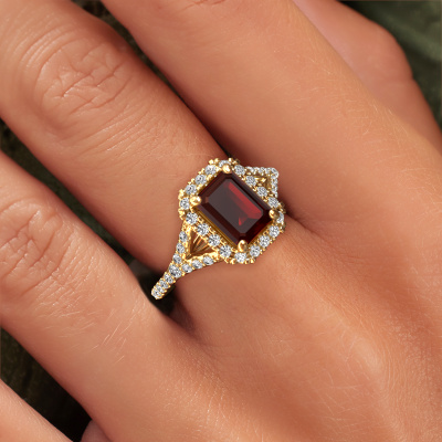 Der oben gezeigte Gold Verlobungsring wird Kimber EME genannt. Es ist ein Pavé Solitär Ring, da er einen zentralen Edelstein und ein Band mit Pavé-Fassung hat. Der exklusive Pavé Solitär Verlobungsring ist in der Kombination 14 Karat Gold mit Gold und ist mit einem smaragd schliff 8x6 mm Granat-Mittelstein besetzt und das Band hat eine Pavé-Fassung mit Lab grown Diamant. Jedes Schmuckstück wird hergestellt von einem Team leidenschaftlicher Goldschmiede und Schmuckdesigner. Das wird Ihr Kronjuwel unbedingt zu einem Blickfang machen. Um den zentralen Stein noch mehr zu betonen, hat das Band eine Pavé-Fassung mit weiteren Granat. Durch die offenen Krappen kann das Licht aus mehreren Winkeln auf den Granat treffen und der Granat-Ring funkelt noch mehr. Das obere Foto zeigt die leidenschaftlich handgefertigten Details des Rings. Die hohe Positionierung der Mittelstein ist ein echter Blickfang. Der perfekte Verlobungsring für das Kronjuwel Ihres Lebens!Durch die Kombination modernster Technik mit uralter Handwerkskunst können wir alle Verlobungsringe in unserem eigenen Studio anfertigen. Jedes Schmuckstück wird auf Anfrage gefertigt. Das ist vorteilhaft, weil wir Ihnen dadurch einen Preis anbieten können, den Sie nirgendwo anders finden.Unser Team fügt unserer Online-Kollektion täglich neue Designs hinzu. Unsere Designer und Goldschmiede arbeiten zusammen, um das beste Design zu kreieren. Wir bemühen uns, eine vielfältige Kollektion von Schmuckstücken anzubieten. Vielleicht haben Sie ein bestimmtes Design im Sinn. Eines, dass Sie irgendwo gesehen haben. Gerne geben wir Ihnen eine kostenlose Beratung. Wir machen Ihnen ein Angebot, basierend auf einem fairen Preis/Leistungsverhältnis, das Sie verblüffen wird.Um es einfacher zu machen, bieten wir eine kostenlose 30-tägige Rücksendung.