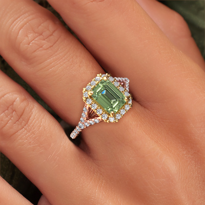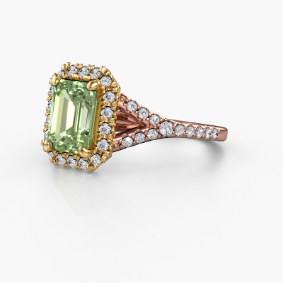 Der oben gezeigte Roségold Verlobungsring wird Kimber EME genannt. Es ist ein Pavé Solitär Ring, da er einen zentralen Edelstein und ein Band mit Pavé-Fassung hat. Der exklusive Pavé Solitär Verlobungsring ist in der Kombination 585 Roségold mit Gold und ist mit einem smaragd schliff 8x6 mm grüner Labor-Diamant-Mittelstein besetzt und das Band hat eine Pavé-Fassung mit Lab grown Diamant. Jedes Schmuckstück wird hergestellt von einem Team leidenschaftlicher Goldschmiede und Schmuckdesigner. Das wird Ihr Kronjuwel unbedingt zu einem Blickfang machen. Um den zentralen Stein noch mehr zu betonen, hat das Band eine Pavé-Fassung mit weiteren grüner Labor-Diamant. Durch die offenen Krappen kann das Licht aus mehreren Winkeln auf den grüner Labor-Diamant treffen und der grüner Labor-Diamant-Ring funkelt noch mehr. Das obere Foto zeigt die leidenschaftlich handgefertigten Details des Rings. Die hohe Positionierung der Mittelstein ist ein echter Blickfang. Der perfekte Verlobungsring für das Kronjuwel Ihres Lebens!Durch die Kombination modernster Technik mit uralter Handwerkskunst können wir alle Verlobungsringe in unserem eigenen Studio anfertigen. Jedes Schmuckstück wird auf Anfrage gefertigt. Das ist vorteilhaft, weil wir Ihnen dadurch einen Preis anbieten können, den Sie nirgendwo anders finden.Unser Team fügt unserer Online-Kollektion täglich neue Designs hinzu. Unsere Designer und Goldschmiede arbeiten zusammen, um das beste Design zu kreieren. Wir bemühen uns, eine vielfältige Kollektion von Schmuckstücken anzubieten. Vielleicht haben Sie ein bestimmtes Design im Sinn. Eines, dass Sie irgendwo gesehen haben. Gerne geben wir Ihnen eine kostenlose Beratung. Wir machen Ihnen ein Angebot, basierend auf einem fairen Preis/Leistungsverhältnis, das Sie verblüffen wird.Um es einfacher zu machen, bieten wir eine kostenlose 30-tägige Rücksendung.