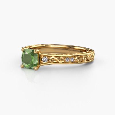 Der oben gezeigte Ring wird Mallory cus genannt. Es ist ein Pavé Solitär Ring, da er einen zentralen Edelstein und ein Band mit Pavé-Fassung hat. Dieser 14 Karat Gold ring ist mit einem 5.5 mm cussion Turmalin grün-Mittelstein besetzt und das Band hat eine Pavé-Fassung mit Diamanten. Jedes Schmuckstück wird von unseren Meister-Goldschmieden in unserem eigenen Studio für Sie gefertigt.Dieser Keltische Gold Pavé Solitär Verlobungsring mit Pavé-Fassung hat einen exquisiten, cussion Turmalin grün als Mittelstein. Um den zentralen Stein noch mehr zu betonen, hat das Band eine Pavé-Fassung mit weiteren Diamanten. Durch die offenen Krappen kann das Licht aus mehreren Winkeln auf den Turmalin grün treffen und der Turmalin grün-Ring funkelt noch mehr. Das obere Foto zeigt die leidenschaftlich handgefertigten Details des Rings. Die hohe Positionierung der Mittelstein ist ein echter Blickfang. Der perfekte Verlobungsring für das Kronjuwel Ihres Lebens!Mit unserer modernen Technik können wir Schmuckstücke von höchster Qualität mit größter Sorgfalt für Sie entwerfen und anpassen. Unsere Verlobungsringe sind immer um 30 Prozent günstiger als bei anderen Juwelieren. Wir fertigen Verlobungsringe auf Bestellung, also müssen wir keine großen Lager unterhalten. Wenn Sie ein bestimmtes Budget haben, beraten wir Sie gerne entsprechend.Verschiedene Arten von neuen Ringen werden täglich von unserem Team angefertigt. Vielleicht haben Sie irgendwo einen Pavé Solitär Verlobungsring gefunden. Einen, den Sie Ihrem Liebsten schenken möchten. Bitte zögern Sie nicht, unseren Schmuckdesignern Ihre Gedanken und Ihr Design zu zeigen. Wir würden gerne Ihr Design in einen Keltische Verlobungsring verwandeln. Sie können die Entwicklungen Ihres Ringdesigns verfolgen, da wir sehr detaillierte 3D-Zeichnungen verwenden. Darüber hinaus können Sie einen Dummy des Designs bestellen. Ein Dummy ist ein Kunststoffring, der nach Ihrem Ringdesign gestaltet werden kann. Sie können ihn anprobieren und prüfen, ob der Verlobungsring Ihren Vorstellungen entspricht. Wir senden Ihnen gerne ein unverbindliches Angebot zu einem fairen Preis/Leistungsverhältnis. Das Angebot wird Sie angesichts der Qualität des Rings und der Edelsteine verblüffen.Um es einfacher zu machen, bieten wir eine kostenlose 30-tägige Rücksendung.