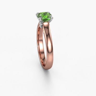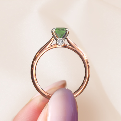 Der oben gezeigte Verlobungsring wird Valorie cus 1 genannt. Wir nennen das einen Solitär-Ring, denn er hat einen einzelnen Edelstein. Es ist ein 585 Roségold ring, mit 6 mm cussion Turmalin grün. Das Besondere an unserem Konfigurator ist dass Sie selbst einem Schmuckstück zusammenstellen können zu einem eigenen persönlichen Schmuckstück. Dieser Solitäre Verlobungsring ist gefertigt in der Edelmetall Kombination Roségold mit Weißgold, aber Sie können also auch wählen aus anderen Farben. Jedes Schmuckstück lässt Ihren Finger erstrahlen. Ihr Ring ist mit Liebe von unseren Goldschmieden handgefertigt. Der Solitär-Verlobungsring ist eine Sonderform des Verlobungsring. Seine offenen Krappen ermöglichen, dass Licht aus mehr Winkeln auf den Edelstein trifft. Dieser klassische Verlobungsring ist durch die hohe Positionierung des Edelsteins ein atemberaubender Blickfang. Wir schmücken diesen Solitär-Ring sorgfältig von Hand, damit Sie Ihren Anfrage mit einem einzigartigen Ring würdigen können. Die Liebe Ihres Lebens verdient nur das Beste. Haben Sie ein bestimmtes Budget? Sie können uns gerne kontaktieren, damit wir Ihre Optionen besprechen können. Wir bieten unsere Verlobungsringe zum garantiert besten Preis, denn wir fertigen sie auf Bestellung. Solche Preise finden Sie nirgendwo anders!Haben Sie irgendwo einen bestimmten Verlobungsring gefunden, den Sie Ihrem Liebsten schenken möchten? Sie können uns gerne sagen, was Sie wollen und wir werden Ihr Design in einen Einzigartigen klassische Verlobungsring verwandeln. Sie können die Entwicklungen Ihres Ringdesigns verfolgen, da wir 3D-Zeichnungen verwenden. Das gibt Ihnen eine realistische Vorschau, wie Ihr Design aussehen wird. Sie können auch einen Dummy vorbestellen. Ein Dummy ist ein Kunststoffring, der nach Ihrem Ringdesign gestaltet werden kann. Sie können ihn anprobieren und prüfen, ob seine Breite und Größe für Sie geeignet sind. Wir senden Ihnen gerne ein unverbindliches Angebot zu einem fairen Preis/Leistungsverhältnis. Sie werden in Anbetracht der Qualität des Rings und der Edelsteine überrascht sein.Um es einfacher zu machen, bieten wir eine kostenlose 30-tägige Rücksendung.