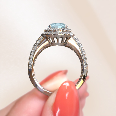 Dieser Ring aus Platin heißt Nancie und hat 9x7 mm Aquamarin. Dieser graziöse Platin Halo Verlobungsring ist ein wahres Kunstwerk! Die Ornamente werden mit viel Geduld und großer Leidenschaft gefertigt. Um diesen Ring mit großer Präzision zu schaffen, erfordert dieses Handwerk ein scharfes Auge und eine geschickte Hand. Eine Herausforderung, die bei unseren erfahrenen Juwelieren ein Feuer entfacht. Die exquisiten Aquamarins sind auf eine besondere Art und Weise gefasst, so dass sie noch mehr hervorstechen. Dies verleiht dem Ring eine noch glamourösere Erscheinung. Der Ring an sich ist schon wegen der Edelsteine einzigartig, die wir speziell für diesen Ring auswählen. Obendrein wählen Sie die Edelmetalle aus, mit denen Ihr einzigartiger Ring für die außergewöhnlichste Frau Ihres Lebens gemacht wird! Jedes Schmuckstück ist um Ihrem Finger Glanz zu verleihen. Jeder Ring wird von unseren Goldschmieden liebevoll von Hand gefertigt.Haben Sie ein bestimmtes Budget? Sie können uns gerne kontaktieren, damit wir Ihre Optionen besprechen können. Wir bieten unsere Verlobungsringe zum garantiert besten Preis, denn wir fertigen sie auf Bestellung. Solche Preise finden Sie nirgendwo anders!Unsere Designer und Goldschmiede arbeiten jeden Tag zusammen und versuchen, neue Schmuckstücke zu kreieren. Vielleicht haben Sie irgendwo einen schönen, klassische Verlobungsring gefunden, nach dem Ihr einzigartiger Ring gestaltet werden kann. Setzen Sie sich mit uns in Verbindung. Wir machen Ihnen ein Angebot, basierend auf einem fairen Preis/Leistungsverhältnis, das Sie begeistern wird.Um es einfacher zu machen, bieten wir eine kostenlose 30-tägige Rücksendung.