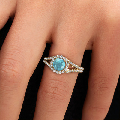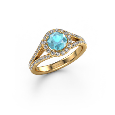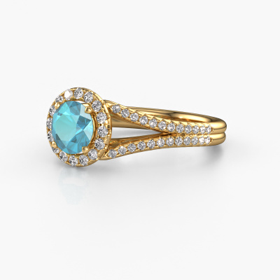 Dieser Ring aus 14 Karat Gold heißt Verla rnd 2 und hat 6.5 mm Blau Topas. Dieser gespaltene Bänder 14 Karat Gold Halo Verlobungsring ist ein wahres Kunstwerk! Die Ornamente werden mit viel Geduld und großer Leidenschaft gefertigt. Um diesen Ring mit großer Präzision zu schaffen, erfordert dieses Handwerk ein scharfes Auge und eine geschickte Hand. Eine Herausforderung, die bei unseren erfahrenen Juwelieren ein Feuer entfacht. Die exquisiten Blaue Topas sind auf eine besondere Art und Weise gefasst, so dass sie noch mehr hervorstechen. Dies verleiht dem Ring eine noch glamourösere Erscheinung. Der Ring an sich ist schon wegen der Edelsteine einzigartig, die wir speziell für diesen Ring auswählen. Obendrein wählen Sie die Edelmetalle aus, mit denen Ihr einzigartiger Ring für die außergewöhnlichste Frau Ihres Lebens gemacht wird! Jedes Schmuckstück wird nur für Sie persönlich hergestellt, mit Liebe zum Detail und Design.Da wir unsere eigenen Ringe entwerfen und liefern, können wir Ihnen einen Verlobungsring zu einem Preis anbieten, den Sie nirgendwo anders finden. Ein Ring wird auf Bestellung angefertigt, wodurch kein überschüssiges Material anfällt. So können wir Ihnen ein gutes Angebot zum besten Preis machen. Wir verstehen, dass es sich riskant anfühlt, Ihren Verlobungsring online zu kaufen. Jedoch helfen wir Ihnen gerne beim Designprozess unter Berücksichtigung Ihres Budgets.Unser Team fügt unserer Online-Kollektion täglich neue Designs hinzu. Unsere Designer und Goldschmiede arbeiten zusammen, um das beste Design zu kreieren. Wir bemühen uns, eine vielfältige Kollektion von Schmuckstücken anzubieten. Vielleicht haben Sie ein bestimmtes Design im Sinn. Eines, dass Sie irgendwo gesehen haben. Gerne geben wir Ihnen eine kostenlose Beratung. Wir machen Ihnen ein Angebot, basierend auf einem fairen Preis/Leistungsverhältnis, das Sie verblüffen wird.Um es einfacher zu machen, bieten wir eine kostenlose 30-tägige Rücksendung.