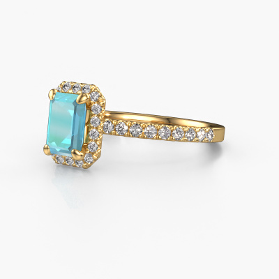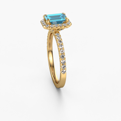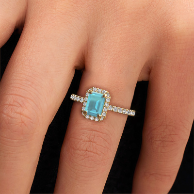 Der oben gezeigte Verlobungsring wird Miranda eme genannt. Es ist ein Halo Ring, da er einen zentralen Edelstein und ein Band mit Pavé-Fassung hat. Der 14 Karat Gold ring ist mit einem 7x5 mm smaragd schliff Blau Topas-Mittelstein besetzt und um ihn herum eine Pavé-Fassung mit Diamanten. Was diesen klassische, Gold Halo Ring besonders macht, sind die kleineren Steine, die den zentralen Stein umschließen. Dieser wunderschöne Verlobungsring wird als Halo Ring bezeichnet, da die kleineren Edelsteine dem zentralen Stein einen Lichthof geben. Damit die kleineren Steine den Mittelstein verstärken, müssen sie so platziert werden, dass keine Lichteinflüsse auftreten. Und hier kommen unsere erfahrenen Goldschmiede ins Spiel. Jeder einzelne Stein wird sorgfältig von Hand in den Ring gesetzt. Während der Herstellung wird der Lichteinfall ständig überprüft. So können wir sicherstellen, dass der spezielle Lichtkranz noch sichtbar ist. Am Ende erhalten Sie einen einzigartigen Verlobungsring mit einem Blaue Topas Ihrer Wahl in der Mitte. Sie können sich die Wirkung eines solchen Ringes vorstellen, wenn Sie ihn an ihrem besonderen Tag für sie zum Leuchten bringen. Durch die Kombination modernster Technik mit uralter Handwerkskunst können wir alle Verlobungsringe in unserem eigenen Studio anfertigen. Jedes Schmuckstück wird auf Anfrage gefertigt. Das ist vorteilhaft, weil wir Ihnen dadurch einen Preis anbieten können, den Sie nirgendwo anders finden.Unsere Designer und Goldschmiede arbeiten jeden Tag zusammen und versuchen, neue Schmuckstücke zu kreieren. Vielleicht haben Sie irgendwo einen schönen, klassische Verlobungsring gefunden, nach dem Ihr einzigartiger Ring gestaltet werden kann. Setzen Sie sich mit uns in Verbindung. Wir machen Ihnen ein Angebot, basierend auf einem fairen Preis/Leistungsverhältnis, das Sie begeistern wird.Um es einfacher zu machen, bieten wir eine kostenlose 30-tägige Rücksendung.
