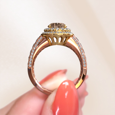 Dieser Ring aus 14 Karat Roségold heißt Nancie und hat 2.89 crt Braun Diamant. Dieser graziöse 14 Karat Roségold Halo Verlobungsring ist ein wahres Kunstwerk! Die Ornamente werden mit viel Geduld und großer Leidenschaft gefertigt. Um diesen Ring mit großer Präzision zu schaffen, erfordert dieses Handwerk ein scharfes Auge und eine geschickte Hand. Eine Herausforderung, die bei unseren erfahrenen Juwelieren ein Feuer entfacht. Die exquisiten Braune Diamanten sind auf eine besondere Art und Weise gefasst, so dass sie noch mehr hervorstechen. Dies verleiht dem Ring eine noch glamourösere Erscheinung. Der Ring an sich ist schon wegen der Edelsteine einzigartig, die wir speziell für diesen Ring auswählen. Obendrein wählen Sie die Edelmetalle aus, mit denen Ihr einzigartiger Ring für die außergewöhnlichste Frau Ihres Lebens gemacht wird! Jedes Schmuckstück ist um Ihrem Finger Glanz zu verleihen. Jeder Ring wird von unseren Goldschmieden liebevoll von Hand gefertigt.Haben Sie ein bestimmtes Budget? Sie können uns gerne kontaktieren, damit wir Ihre Optionen besprechen können. Wir bieten unsere Verlobungsringe zum garantiert besten Preis, denn wir fertigen sie auf Bestellung. Solche Preise finden Sie nirgendwo anders!Unsere Designer und Goldschmiede arbeiten jeden Tag zusammen und versuchen, neue Schmuckstücke zu kreieren. Vielleicht haben Sie irgendwo einen schönen, klassische Verlobungsring gefunden, nach dem Ihr einzigartiger Ring gestaltet werden kann. Setzen Sie sich mit uns in Verbindung. Wir machen Ihnen ein Angebot, basierend auf einem fairen Preis/Leistungsverhältnis, das Sie begeistern wird.Um es einfacher zu machen, bieten wir eine kostenlose 30-tägige Rücksendung.