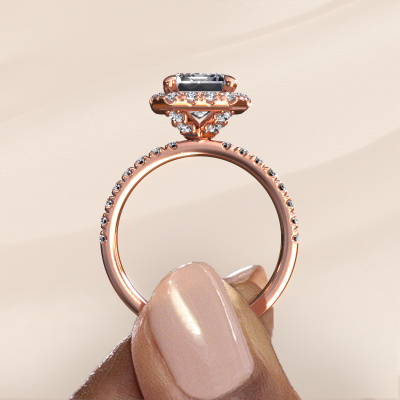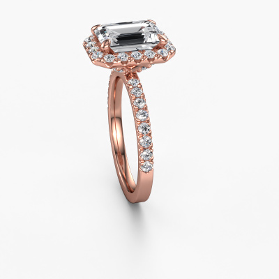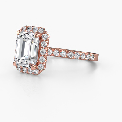 Der oben gezeigte Verlobungsring wird Miranda EME genannt. Es ist ein Halo Ring, da er einen zentralen Edelstein und ein Band mit Pavé-Fassung hat. Der 585 Roségold ring ist mit einem 2.50 crt smaragd schliff Diamant-Mittelstein besetzt und um ihn herum eine Pavé-Fassung mit Diamanten. Was diesen klassische, Roségold Halo Ring besonders macht, sind die kleineren Steine, die den zentralen Stein umschließen. Dieser wunderschöne Verlobungsring wird als Halo Ring bezeichnet, da die kleineren Edelsteine dem zentralen Stein einen Lichthof geben. Damit die kleineren Steine den Mittelstein verstärken, müssen sie so platziert werden, dass keine Lichteinflüsse auftreten. Und hier kommen unsere erfahrenen Goldschmiede ins Spiel. Jeder einzelne Stein wird sorgfältig von Hand in den Ring gesetzt. Während der Herstellung wird der Lichteinfall ständig überprüft. So können wir sicherstellen, dass der spezielle Lichtkranz noch sichtbar ist. Am Ende erhalten Sie einen einzigartigen Verlobungsring mit einem Diamanten Ihrer Wahl in der Mitte. Sie können sich die Wirkung eines solchen Ringes vorstellen, wenn Sie ihn an ihrem besonderen Tag für sie zum Leuchten bringen. Durch die Kombination modernster Technik mit uralter Handwerkskunst können wir alle Verlobungsringe in unserem eigenen Studio anfertigen. Jedes Schmuckstück wird auf Anfrage gefertigt. Das ist vorteilhaft, weil wir Ihnen dadurch einen Preis anbieten können, den Sie nirgendwo anders finden.Unsere Designer und Goldschmiede arbeiten jeden Tag zusammen und versuchen, neue Schmuckstücke zu kreieren. Vielleicht haben Sie irgendwo einen schönen, klassische Verlobungsring gefunden, nach dem Ihr einzigartiger Ring gestaltet werden kann. Setzen Sie sich mit uns in Verbindung. Wir machen Ihnen ein Angebot, basierend auf einem fairen Preis/Leistungsverhältnis, das Sie begeistern wird.Um es einfacher zu machen, bieten wir eine kostenlose 30-tägige Rücksendung.
