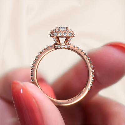 Der oben gezeigte Verlobungsring wird Talitha CUS genannt. Es ist ein Halo Ring, da er einen zentralen Edelstein und ein Band mit Pavé-Fassung hat. Der 14 Karat Roségold ring ist mit einem 0.33 crt cussion Diamant-Mittelstein besetzt und um ihn herum eine Pavé-Fassung mit Diamanten. Was diesen traditionell, Roségold Halo Ring besonders macht, sind die kleineren Steine, die den zentralen Stein umschließen. Dieser wunderschöne Verlobungsring wird als Halo Ring bezeichnet, da die kleineren Edelsteine dem zentralen Stein einen Lichthof geben. Damit die kleineren Steine den Mittelstein verstärken, müssen sie so platziert werden, dass keine Lichteinflüsse auftreten. Und hier kommen unsere erfahrenen Goldschmiede ins Spiel. Jeder einzelne Stein wird sorgfältig von Hand in den Ring gesetzt. Während der Herstellung wird der Lichteinfall ständig überprüft. So können wir sicherstellen, dass der spezielle Lichtkranz noch sichtbar ist. Am Ende erhalten Sie einen einzigartigen Verlobungsring mit einem Diamanten Ihrer Wahl in der Mitte. Sie können sich die Wirkung eines solchen Ringes vorstellen, wenn Sie ihn an ihrem besonderen Tag für sie zum Leuchten bringen. Da wir unsere eigenen Ringe entwerfen und liefern, können wir Ihnen einen Verlobungsring zu einem Preis anbieten, den Sie nirgendwo anders finden. Ein Ring wird auf Bestellung angefertigt, wodurch kein überschüssiges Material anfällt. So können wir Ihnen ein gutes Angebot zum besten Preis machen. Wir verstehen, dass es sich riskant anfühlt, Ihren Verlobungsring online zu kaufen. Jedoch helfen wir Ihnen gerne beim Designprozess unter Berücksichtigung Ihres Budgets.Unsere Designer und Goldschmiede arbeiten jeden Tag zusammen und versuchen, neue Schmuckstücke zu kreieren. Vielleicht haben Sie irgendwo einen schönen, traditionell Verlobungsring gefunden, nach dem Ihr einzigartiger Ring gestaltet werden kann. Setzen Sie sich mit uns in Verbindung. Wir machen Ihnen ein Angebot, basierend auf einem fairen Preis/Leistungsverhältnis, das Sie begeistern wird.Um es einfacher zu machen, bieten wir eine kostenlose 30-tägige Rücksendung.