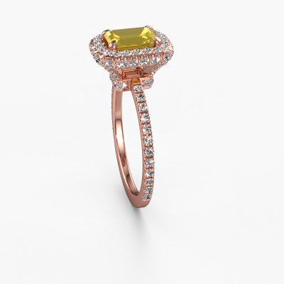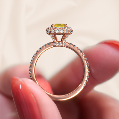 Der oben gezeigte Verlobungsring wird Talitha EME genannt. Es ist ein Halo Ring, da er einen zentralen Edelstein und ein Band mit Pavé-Fassung hat. Der 14 Karat Roségold ring ist mit einem 7x5 mm smaragd schliff Gelb Saphir-Mittelstein besetzt und um ihn herum eine Pavé-Fassung mit Lab grown Diamant. Was diesen Luxus, Roségold Halo Ring besonders macht, sind die kleineren Steine, die den zentralen Stein umschließen. Dieser wunderschöne Verlobungsring wird als Halo Ring bezeichnet, da die kleineren Edelsteine dem zentralen Stein einen Lichthof geben. Damit die kleineren Steine den Mittelstein verstärken, müssen sie so platziert werden, dass keine Lichteinflüsse auftreten. Und hier kommen unsere erfahrenen Goldschmiede ins Spiel. Jeder einzelne Stein wird sorgfältig von Hand in den Ring gesetzt. Während der Herstellung wird der Lichteinfall ständig überprüft. So können wir sicherstellen, dass der spezielle Lichtkranz noch sichtbar ist. Am Ende erhalten Sie einen einzigartigen Verlobungsring mit einem Gelb Saphir Ihrer Wahl in der Mitte. Sie können sich die Wirkung eines solchen Ringes vorstellen, wenn Sie ihn an ihrem besonderen Tag für sie zum Leuchten bringen. Mit unserer modernen Technik können wir Schmuckstücke von höchster Qualität mit größter Sorgfalt für Sie entwerfen und anpassen. Unsere Verlobungsringe sind immer um 30 Prozent günstiger als bei anderen Juwelieren. Wir fertigen Verlobungsringe auf Bestellung, also müssen wir keine großen Lager unterhalten. Wenn Sie ein bestimmtes Budget haben, beraten wir Sie gerne entsprechend.Unser Team fügt unserer Online-Kollektion täglich neue Designs hinzu. Unsere Designer und Goldschmiede arbeiten zusammen, um das beste Design zu kreieren. Wir bemühen uns, eine vielfältige Kollektion von Schmuckstücken anzubieten. Vielleicht haben Sie ein bestimmtes Design im Sinn. Eines, dass Sie irgendwo gesehen haben. Gerne geben wir Ihnen eine kostenlose Beratung. Wir machen Ihnen ein Angebot, basierend auf einem fairen Preis/Leistungsverhältnis, das Sie verblüffen wird.Um es einfacher zu machen, bieten wir eine kostenlose 30-tägige Rücksendung.