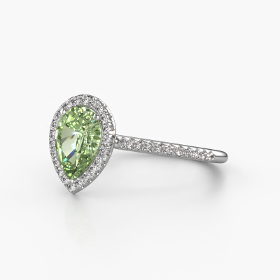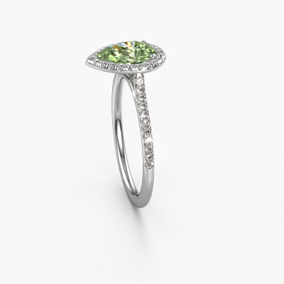 Der oben gezeigte Verlobungsring wird Seline per 2 genannt. Es ist ein Halo Ring, da er einen zentralen Edelstein und ein Band mit Pavé-Fassung hat. Der Platin ring ist mit einem 8x6 mm tropfen grüner Labor-Diamant-Mittelstein besetzt und um ihn herum eine Pavé-Fassung mit Diamanten. Was diesen klassische, Platin Halo Ring besonders macht, sind die kleineren Steine, die den zentralen Stein umschließen. Dieser wunderschöne Verlobungsring wird als Halo Ring bezeichnet, da die kleineren Edelsteine dem zentralen Stein einen Lichthof geben. Damit die kleineren Steine den Mittelstein verstärken, müssen sie so platziert werden, dass keine Lichteinflüsse auftreten. Und hier kommen unsere erfahrenen Goldschmiede ins Spiel. Jeder einzelne Stein wird sorgfältig von Hand in den Ring gesetzt. Während der Herstellung wird der Lichteinfall ständig überprüft. So können wir sicherstellen, dass der spezielle Lichtkranz noch sichtbar ist. Am Ende erhalten Sie einen einzigartigen Verlobungsring mit einem grüner Labor-Diamanten Ihrer Wahl in der Mitte. Sie können sich die Wirkung eines solchen Ringes vorstellen, wenn Sie ihn an ihrem besonderen Tag für sie zum Leuchten bringen. Da wir unsere eigenen Ringe entwerfen und liefern, können wir Ihnen einen Verlobungsring zu einem Preis anbieten, den Sie nirgendwo anders finden. Ein Ring wird auf Bestellung angefertigt, wodurch kein überschüssiges Material anfällt. So können wir Ihnen ein gutes Angebot zum besten Preis machen. Wir verstehen, dass es sich riskant anfühlt, Ihren Verlobungsring online zu kaufen. Jedoch helfen wir Ihnen gerne beim Designprozess unter Berücksichtigung Ihres Budgets.Unsere Designer und Goldschmiede arbeiten jeden Tag zusammen und versuchen, neue Schmuckstücke zu kreieren. Vielleicht haben Sie irgendwo einen schönen, klassische Verlobungsring gefunden, nach dem Ihr einzigartiger Ring gestaltet werden kann. Setzen Sie sich mit uns in Verbindung. Wir machen Ihnen ein Angebot, basierend auf einem fairen Preis/Leistungsverhältnis, das Sie begeistern wird.Um es einfacher zu machen, bieten wir eine kostenlose 30-tägige Rücksendung.