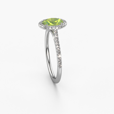 Der oben gezeigte Verlobungsring wird Seline ovl 2 genannt. Es ist ein Halo Ring, da er einen zentralen Edelstein und ein Band mit Pavé-Fassung hat. Der 14 Karat Weißgold ring ist mit einem 7x5 mm oval Peridot-Mittelstein besetzt und um ihn herum eine Pavé-Fassung mit Diamanten. Was diesen exklusive, Weißgold Halo Ring besonders macht, sind die kleineren Steine, die den zentralen Stein umschließen. Dieser wunderschöne Verlobungsring wird als Halo Ring bezeichnet, da die kleineren Edelsteine dem zentralen Stein einen Lichthof geben. Damit die kleineren Steine den Mittelstein verstärken, müssen sie so platziert werden, dass keine Lichteinflüsse auftreten. Und hier kommen unsere erfahrenen Goldschmiede ins Spiel. Jeder einzelne Stein wird sorgfältig von Hand in den Ring gesetzt. Während der Herstellung wird der Lichteinfall ständig überprüft. So können wir sicherstellen, dass der spezielle Lichtkranz noch sichtbar ist. Am Ende erhalten Sie einen einzigartigen Verlobungsring mit einem Peridot Ihrer Wahl in der Mitte. Sie können sich die Wirkung eines solchen Ringes vorstellen, wenn Sie ihn an ihrem besonderen Tag für sie zum Leuchten bringen. Nachdem Sie Ihre Bestellung aufgegeben haben, beginnen unsere Goldschmiede mit dem kreativen Prozess der Herstellung Ihres Seline ovl 2 Verlobungsring. Wir haben keine Lager. Das ist vorteilhaft, da diese Kosten nicht an Sie weitergegeben werden. Daher sind wir in der Lage, Schmuck zu außergewöhnlich niedrigen Preisen anzubieten.Unser Team fügt unserer Online-Kollektion täglich neue Designs hinzu. Unsere Designer und Goldschmiede arbeiten zusammen, um das beste Design zu kreieren. Wir bemühen uns, eine vielfältige Kollektion von Schmuckstücken anzubieten. Vielleicht haben Sie ein bestimmtes Design im Sinn. Eines, dass Sie irgendwo gesehen haben. Gerne geben wir Ihnen eine kostenlose Beratung. Wir machen Ihnen ein Angebot, basierend auf einem fairen Preis/Leistungsverhältnis, das Sie verblüffen wird.Um es einfacher zu machen, bieten wir eine kostenlose 30-tägige Rücksendung.