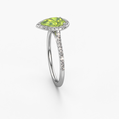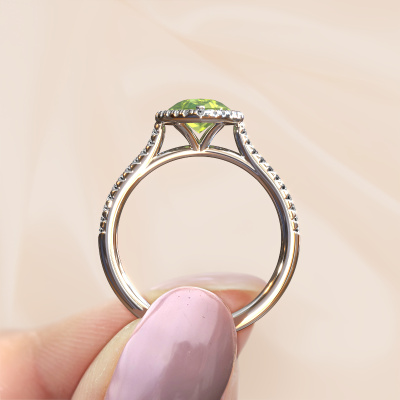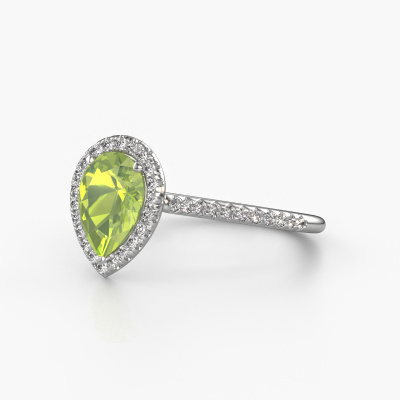 Der oben gezeigte Verlobungsring wird Seline per 2 genannt. Es ist ein Halo Ring, da er einen zentralen Edelstein und ein Band mit Pavé-Fassung hat. Der 14 Karat Weißgold ring ist mit einem 8x6 mm tropfen Peridot-Mittelstein besetzt und um ihn herum eine Pavé-Fassung mit Diamanten. Was diesen klassische, Weißgold Halo Ring besonders macht, sind die kleineren Steine, die den zentralen Stein umschließen. Dieser wunderschöne Verlobungsring wird als Halo Ring bezeichnet, da die kleineren Edelsteine dem zentralen Stein einen Lichthof geben. Damit die kleineren Steine den Mittelstein verstärken, müssen sie so platziert werden, dass keine Lichteinflüsse auftreten. Und hier kommen unsere erfahrenen Goldschmiede ins Spiel. Jeder einzelne Stein wird sorgfältig von Hand in den Ring gesetzt. Während der Herstellung wird der Lichteinfall ständig überprüft. So können wir sicherstellen, dass der spezielle Lichtkranz noch sichtbar ist. Am Ende erhalten Sie einen einzigartigen Verlobungsring mit einem Peridot Ihrer Wahl in der Mitte. Sie können sich die Wirkung eines solchen Ringes vorstellen, wenn Sie ihn an ihrem besonderen Tag für sie zum Leuchten bringen. Da wir unsere eigenen Ringe entwerfen und liefern, können wir Ihnen einen Verlobungsring zu einem Preis anbieten, den Sie nirgendwo anders finden. Ein Ring wird auf Bestellung angefertigt, wodurch kein überschüssiges Material anfällt. So können wir Ihnen ein gutes Angebot zum besten Preis machen. Wir verstehen, dass es sich riskant anfühlt, Ihren Verlobungsring online zu kaufen. Jedoch helfen wir Ihnen gerne beim Designprozess unter Berücksichtigung Ihres Budgets.Unsere Designer und Goldschmiede arbeiten jeden Tag zusammen und versuchen, neue Schmuckstücke zu kreieren. Vielleicht haben Sie irgendwo einen schönen, klassische Verlobungsring gefunden, nach dem Ihr einzigartiger Ring gestaltet werden kann. Setzen Sie sich mit uns in Verbindung. Wir machen Ihnen ein Angebot, basierend auf einem fairen Preis/Leistungsverhältnis, das Sie begeistern wird.Um es einfacher zu machen, bieten wir eine kostenlose 30-tägige Rücksendung.